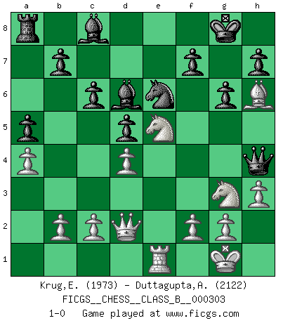 Last move : 1-0 2019 August 31 20:55:49 [Event "FICGS__CHESS__CLASS_B__000303"] [Site "FICGS"] [Date "2019.04.08"] [Round "1"] [White "Krug,Evgeny"] [Black "Duttagupta,Aniruddha"] [Result "1-0"] [WhiteElo "1973"] [BlackElo "2122"] 1.e4 e6 2.d4 d5 3.exd5 exd5 4.Nf3 Bd6 5.Nc3 c6 6.Bd3 Ne7 7.O-O O-O 8.Ne2 Ng6 9.Ng3 Nf4 10.Re1 Nxd3 11.Qxd3 Na6 12.a3 Re8 13.Bd2 Rxe1+ 14.Rxe1 Nc7 15.h3 a5 16.a4 g6 17.Bh6 Ne6 18.Ne5 Qh4 19.Qd2 1-0 This chess game has been lost on time (started : 2019.04.08 15:58:1) French : Exchange variation Kingside Castling by player White (move 7) Kingside Castling by player Black (move 7) Player White won this chess game. Follow this game move after move (download)Chess is a part of culture and if a culture is declining then Chess too will decline. (Mikhail Botvinnik) Unter Putin wird alles Geld aus Russland wie von einem Staubsauger nach Moskau umgeleitet, das ist wie ein schwarzes Loch. (Garry Kasparov) El Peón aislado arroja penumbra sobre todo el tablero. (Aaron Nimzovich) La vie est comme un jeu d'échecs : nous esquissons un plan, mais celui-ci est tributaire de ce que daignent faire l'adversaire aux échecs et le destin dans la vie. (Arthur Schopenhauer) Control your own destiny or someone else will. (Jack Welch)