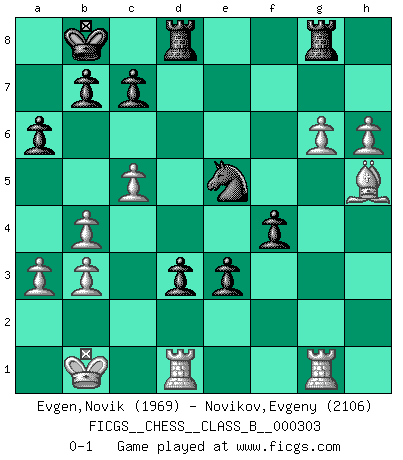 Last move : 0-1 2019 August 8 14:52:50 [Event "FICGS__CHESS__CLASS_B__000303"] [Site "FICGS"] [Date "2019.04.08"] [Round "1"] [White "Evgen,Novik"] [Black "Novikov,Evgeny"] [Result "0-1"] [WhiteElo "1969"] [BlackElo "2106"] 1.Nf3 Nf6 2.Nc3 Nc6 3.d4 d5 4.Bf4 Bg4 5.e3 e6 6.h3 Bxf3 7.Qxf3 a6 8.O-O-O Bd6 9.g4 Bxf4 10.Qxf4 Qe7 11.Kb1 O-O-O 12.h4 Kb8 13.a3 h6 14.Bg2 g5 15.Qg3 Rhg8 16.h5 Rd6 17.Rhe1 Rgd8 18.Bf3 e5 19.Qg2 Na5 20.Na4 Re8 21.Nc5 e4 22.Be2 Nd7 23.f4 gxf4 24.exf4 Nxc5 25.dxc5 R6d8 26.b4 Nc6 27.g5 Qe6 28.Qg4 f5 29.Qg3 hxg5 30.fxg5 d4 31.Qb3 Qxb3+ 32.cxb3 Ne5 33.h6 Rg8 34.Rg1 d3 35.Bh5 e3 36.g6 f4 0-1 Reti Opening Queenside Castling by player White (move 8) Queenside Castling by player Black (move 11) Player Black won this chess game. Follow this game move after move (download)Chess holds its master in its own bonds, shackling the mind and brain so that the inner freedom of the very strongest must suffer. (Albert Einstein) Die unerbitterlichsten Regeln im Schach sind die Ausnahmen. (Savielly Grigorievitsch Tartakower) Una clavada es mas poderosa que una espada. (Fred Reinfeld) Vous n'êtes pas toujours obligé de jouer le meilleur coup. Un coup doit être actif, entreprenant, correct et beau ! (David Bronstein) The weakness of an artist is dogma. (Josh Waitzkin)
