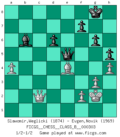 Last move : 1/2-1/2 2019 August 13 6:53:48 [Event "FICGS__CHESS__CLASS_B__000303"] [Site "FICGS"] [Date "2019.04.08"] [Round "1"] [White "Slawomir,Weglicki"] [Black "Evgen,Novik"] [Result "1/2-1/2"] [WhiteElo "1874"] [BlackElo "1969"] 1.e4 c5 2.Nf3 Nc6 3.d4 cxd4 4.Nxd4 e5 5.Nb5 d6 6.N1c3 a6 7.Na3 b5 8.Nd5 Nf6 9.Bd3 Be7 10.Nxf6+ Bxf6 11.c3 O-O 12.Nc2 Be6 13.O-O Qd7 14.a4 bxa4 15.Rxa4 a5 16.Ne3 Bg5 17.Re1 Rfb8 18.Bc2 Ne7 19.Ra3 h6 20.b3 Qc7 21.Bd2 Qc5 22.Qa1 Qc8 23.Nf1 Bf6 24.Qd1 Bg4 25.Qc1 Ng6 26.c4 Nf4 27.Bxf4 exf4 28.Qxf4 Be6 29.Rb1 Qc5 30.Ra2 a4 31.Rxa4 Rxa4 32.bxa4 Rxb1 33.Bxb1 Qb4 34.Bc2 Bxc4 35.Qd2 Bc3 36.Qd1 Be6 37.Ne3 Bd4 38.Nd5 Bxd5 39.exd5 g6 40.g3 Bb6 41.Kg2 h5 42.h4 Qc5 43.Qd2 Ba5 44.Qd1 Bb6 45.Qe2 Qxd5+ 46.Be4 Qe5 47.Qc2 1/2-1/2 Sicilian : Labourdonnais-Loewenthal (Kalashnikov) variation Kingside Castling by player Black (move 11) Kingside Castling by player White (move 13) This chess game ended in a draw. Follow this game move after move (download)We must make sure that Chess will not be like a dead language, very interesting, but for a very small group. (Sytze Faber) Ja, jede Frau in Holland liebt mich bestimmt, und alle Männer hassen mich. (Loek van Wely) El Ajedrez es el gimnasio de la mente. (Blaise Pascal) Mais n'est-ce pas déjà le limiter injurieusement que d'appeler les échecs un jeu? N'est-ce pas aussi une science, un art, ou quelque chose qui, comme le cercueil de Mahomet entre ciel et terre, est suspendu entre l'un et l'autre, et qui réunit un nombre incroyable de contraires ? (Stefan Zweig) Don't anthropomorphize computers - they hate it. (Anonymous)
