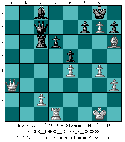 Last move : 1/2-1/2 2019 July 10 13:45:55 [Event "FICGS__CHESS__CLASS_B__000303"] [Site "FICGS"] [Date "2019.04.08"] [Round "1"] [White "Novikov,Evgeny"] [Black "Slawomir,Weglicki"] [Result "1/2-1/2"] [WhiteElo "2106"] [BlackElo "1874"] 1.e4 c5 2.Nf3 e6 3.d4 cxd4 4.Nxd4 a6 5.Nc3 b5 6.Bd3 Qb6 7.Nf3 Nc6 8.O-O Qb8 9.Re1 Bd6 10.Qe2 Ne5 11.Nxe5 Bxe5 12.g3 Nf6 13.f4 Bxc3 14.bxc3 O-O 15.a4 Bb7 16.axb5 axb5 17.Rb1 Qc7 18.Rxb5 Rfc8 19.Bd2 d6 20.c4 Bc6 21.Rb2 e5 22.f5 Ra4 23.R2b1 Nd7 24.Qg4 Nf6 25.Qe2 Bb7 26.g4 Nd7 27.Ra1 Rca8 28.Rxa4 Rxa4 29.Qf1 Nc5 30.f6 Ra2 31.fxg7 Nxd3 32.Qxd3 Ra4 33.Rb1 Ba6 34.Bh6 Rxc4 35.Qa3 Bc8 36.Rd1 Rc6 37.h3 Qb6+ 38.Be3 Qc7 39.Bh6 Qb6+ 40.Be3 Qc7 41.Bh6 1/2-1/2 Sicilian : Kan, 5.Nc3 Kingside Castling by player White (move 8) Kingside Castling by player Black (move 14) This chess game ended in a draw. Follow this game move after move (download)Chess is a part of culture and if a culture is declining then Chess too will decline. (Mikhail Botvinnik) Frage des Reporters: -Worin besteht das Ziel von Gambiteröffnungen? Antwort: -Auf Kosten der Partie einen Ruf als Angriffspieler zu erwerben.- (Siegbert Tarrasch) Un jugador que es sorprendido, esta derrotado a medias. (Proverbio) Karpov est une pièce de musée. (Garry Kasparov) You can only get smarter by playing a smarter opponent. (Revolver, movie)