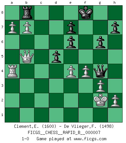 Last move : 1-0 2006 August 13 8:36:40 [Event "FICGS__CHESS__RAPID_B__000007"] [Site "FICGS"] [Date "2006.06.14"] [Round "1"] [White "Clement,Etienne"] [Black "De Vlieger,Filip"] [Result "1-0"] [WhiteElo "1600"] [BlackElo "1498"] 1.e4 c5 2.Nf3 d6 3.d4 cxd4 4.Nxd4 Nc6 5.Bb5 Bd7 6.O-O Nf6 7.Nc3 g6 8.Nd5 Bg7 9.Nxf6+ Bxf6 10.Nxc6 bxc6 11.Bc4 O-O 12.c3 Rb8 13.Bh6 Bg7 14.Bxg7 Kxg7 15.Qd4+ Kg8 16.b3 Be6 17.Bxe6 fxe6 18.Qxa7 Ra8 19.Qb7 c5 20.f4 Rb8 21.Qa6 Ra8 22.Qc4 Qc8 23.a4 Kg7 24.a5 Qd7 25.a6 Rfb8 26.b4 cxb4 27.cxb4 Rc8 28.Qd4+ Kg8 29.Ra5 Rc2 30.b5 Qc8 31.Ra4 Rc1 32.g3 Rxf1+ 33.Kxf1 Qc1+ 34.Kg2 Qc2+ 35.Kh3 Qe2 36.Qc4 Qh5+ 37.Kg2 Kf8 38.b6 d5 39.Qb5 Qg4 40.b7 Rb8 41.a7 1-0 Sicilian Kingside Castling by player White (move 6) Kingside Castling by player Black (move 11) Player White won this chess game. Follow this game move after move (download)I prefer to lose a really good game than to win a bad one. (David Levy) Alle Schachspieler sollten auch ein Hobby haben. (Savielly Grigorievitsch Tartakower) El hombre es un frívolo, una creatura engañosa y como un jugador de Ajedrez, se preocupa mas por el proceso de obtener su meta que de la meta por sí misma. (Dostoyevsky) Les ravages du H expliquent la différence de niveau entre Tal et Thal [Abergel]. Everybody lies. (Gregory House, House M.D.)