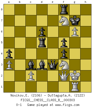 Last move : 0-1 2020 April 7 17:12:23 [Event "FICGS__CHESS__CLASS_B__000303"] [Site "FICGS"] [Date "2019.04.08"] [Round "1"] [White "Novikov,Evgeny"] [Black "Duttagupta,Aniruddha"] [Result "0-1"] [WhiteElo "2106"] [BlackElo "2122"] 1.e4 c5 2.Nf3 d6 3.Nc3 Nc6 4.d4 cxd4 5.Nxd4 Nf6 6.Bc4 Qb6 7.Nb3 e6 8.Be3 Qc7 9.O-O a6 10.Bd3 b5 11.f4 Be7 12.a3 O-O 13.g4 Re8 14.g5 Nd7 15.Qh5 g6 16.Qf3 Rb8 17.Rae1 b4 18.Nd1 Bf8 19.Nf2 Bg7 20.Ng4 Rf8 21.h4 f5 22.exf5 gxf5 23.Nh6+ Kh8 24.Qh5 Nb6 25.Bxb6 Rxb6 26.Kh1 bxa3 27.bxa3 Bc3 28.Re3 Ne7 29.Nf7+ Kg7 30.Nh6 a5 31.Qe2 a4 32.Nd2 e5 33.h5 Nd5 34.Ref3 Nxf4 35.Rxf4 exf4 36.Nf3 Rc6 37.Qg2 Rc5 38.Kh2 Qe7 39.Rf2 Bb7 40.Rf1 Bd4 41.Kh3 Qe8 42.Kh4 Bc3 43.Qf2 Qe3 44.Kh3 Kh8 45.g6 hxg6 46.hxg6 Kg7 47.Nf7 Be4 48.Kg2 Rd5 49.Rg1 Bxd3 0-1 Sicilian Kingside Castling by player White (move 9) Kingside Castling by player Black (move 12) Player Black won this chess game. Follow this game move after move (download)Via the squares on the chessboard, the Indians explain the movement of time and the age, the higher influences which control the world and the ties which link Chess with the human soul. (Al-Masudi) Ein Großmeister muß tausende Partien in seinem Kopf speichern, denn diese sind für Ihn, was die Worte der Muttersprache für gewöhnliche Leute sind, oder Noten für Musiker... (Garry Kasparov) Las combinaciones han sido siempre el aspecto más intrigante del Ajedrez. Los Maestros las buscan, el público las aplauden, los críticos las alaban. La razón se debe a que las combinaciones hacen posible que el Ajedrez sea más que un ejercicio matemático con una carencia de vida. Ellas son la poesía del juego, son del Ajedrez lo que la melodía es de la música. Ellas representan el triunfo de la mente sobre la materia. (Reuben Fine) Le profane ne songe pas à la somme de jouissance dont il se prive, qui méconnaît ce jeu aux ressources aussi variées que passionnantes. (Jean-Marie Jeanton-Lamarche) Luck is the residue of design. (John Milton)