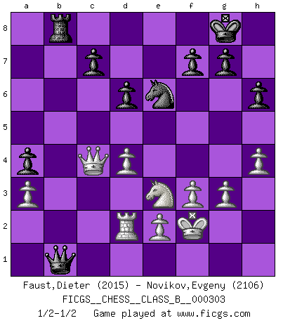 Last move : 1/2-1/2 2019 August 7 15:10:28 [Event "FICGS__CHESS__CLASS_B__000303"] [Site "FICGS"] [Date "2019.04.08"] [Round "1"] [White "Faust,Dieter"] [Black "Novikov,Evgeny"] [Result "1/2-1/2"] [WhiteElo "2015"] [BlackElo "2106"] 1.c4 e5 2.g3 Nc6 3.Bg2 Nf6 4.Nc3 Bb4 5.Nf3 Bxc3 6.bxc3 O-O 7.O-O d6 8.d3 Re8 9.Bg5 Rb8 10.Ne1 h6 11.Bxf6 Qxf6 12.Nc2 e4 13.Bxe4 Qxc3 14.Rb1 Bh3 15.Bg2 Bxg2 16.Kxg2 Qa5 17.a3 b5 18.Rxb5 Rxb5 19.cxb5 Qxb5 20.Qd2 Qb2 21.Rd1 Nd8 22.d4 Ne6 23.Qd3 Qb7+ 24.f3 Rb8 25.Ne3 a5 26.Kf2 Qb2 27.h4 a4 28.Rd2 Qb1 29.Qc4 Qb3 30.Qc1 Qb1 31.Qc4 Qb3 32.Qc1 Qb1 33.Qc4 1/2-1/2 English Opening Kingside Castling by player Black (move 6) Kingside Castling by player White (move 7) This chess game ended in a draw. Follow this game move after move (download)Chess is above all, a fight ! (Emanuel Lasker) Ich erzeugte keinen Neid, da mich die Schachspieler als Musiker und die Musiker als Schachspieler betrachteten. (Mark Taimanov) Realmente no sabemos como el juego fue inventado, aunque hay sospechas. Tan pronto como descubramos a los culpables, se los haremos saber. (Bruce Pandolfini) Même un GMI sait rarement calculer sur plus de cinq coups une attaque à sacrifices. (Rudolf Spielmann) Luck never made a man wise. (Seneca, Letters to Lucilius)