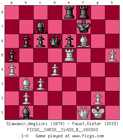 Last move : 1-0 2019 July 6 16:26:7 [Event "FICGS__CHESS__CLASS_B__000303"] [Site "FICGS"] [Date "2019.04.08"] [Round "1"] [White "Slawomir,Weglicki"] [Black "Faust,Dieter"] [Result "1-0"] [WhiteElo "1874"] [BlackElo "2015"] 1.e4 c6 2.d4 d5 3.Nc3 dxe4 4.Nxe4 Nd7 5.Nf3 Ngf6 6.Nxf6+ Nxf6 7.Bc4 Bf5 8.O-O e6 9.c3 Bd6 10.Re1 h6 11.Ne5 O-O 12.Bf4 Qc7 13.Qf3 Rad8 14.h3 Nd5 15.Bg3 Ne7 16.a4 a5 17.Bb3 Nc8 18.Rad1 Nb6 19.Kh1 Bh7 20.Re2 Qe7 21.Qg4 Bf5 22.Qf3 Qc7 23.R1d2 Qc8 24.Rd1 Bh7 25.Kg1 Bc7 26.Rde1 Nd5 27.Rd2 Ne7 28.Bh4 Rde8 29.Bg3 Nf5 30.Bf4 Nh4 31.Qg3 g5 32.Nd3 Bd8 33.Be5 b6 34.Nf4 Qd7 35.Rde2 Nf5 36.Qg4 Ng7 37.Nh5 Bf5 38.Qf3 Nxh5 39.Qxh5 Kh7 40.f4 Bg6 41.Qf3 gxf4 42.Bxf4 Bc7 43.Bd2 Qd6 44.Re5 Kg7 45.h4 f6 46.Qe3 fxe5 47.Qxh6+ Kf7 48.Bg5 Bf5 49.Rxe5 Bg6 50.h5 Bb1 51.Bf6 Rg8 52.Qf4 Rgf8 53.Qf1 1-0 Caro-Kann : Steinitz variation Kingside Castling by player White (move 8) Kingside Castling by player Black (move 11) Player White won this chess game. Follow this game move after move (download)Chess books should be used as we use glasses: to assist the sight, although some players make use of them as if they thought they conferred sight. (Jose Raul Capablanca) Wenn Du einsam bist, wenn Du Dich in der Welt wie ein Fremder fühlst, spiele Schach. Das wird Deinen Geist erheben und Dein Ratgeber im Kampf sein. (Aristoteles) El Ajedrez es tan interesante por sí solo, que no es necesario un interés monetario para persuadir a una persona a que lo practique; por lo tanto, nunca se juega por dinero. (Benjamin Franklin) Je fais ceci parce que dans cinquante coups j'obtiendrai cela; je m'appelle Mikhail Moisevitch Botvinnik. (Botvinnik) Experiences are the keys to life. (Daniel Parmet)