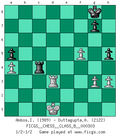 Last move : 1/2-1/2 2019 December 14 8:24:27 [Event "FICGS__CHESS__CLASS_B__000303"] [Site "FICGS"] [Date "2019.04.08"] [Round "1"] [White "Ambos,Ilmar"] [Black "Duttagupta,Aniruddha"] [Result "1/2-1/2"] [WhiteElo "1989"] [BlackElo "2122"] 1.d4 Nf6 2.c4 e6 3.Nf3 b6 4.g3 Ba6 5.b3 Bb7 6.Bg2 Bb4+ 7.Bd2 a5 8.O-O O-O 9.Qc2 d6 10.Nc3 Nbd7 11.Rfe1 Bxc3 12.Bxc3 Be4 13.Qb2 c6 14.a4 d5 15.Rac1 Qe7 16.Nd2 Bxg2 17.Kxg2 c5 18.dxc5 bxc5 19.cxd5 exd5 20.Bxf6 Nxf6 21.Qc2 Rfc8 22.e4 d4 23.Nc4 Qe6 24.Kg1 Rd8 25.Qd3 Qa6 26.Qd2 Rdb8 27.e5 Nd7 28.Qd1 Qc6 29.f4 Qd5 30.Rf1 f6 31.exf6 Nxf6 32.Re1 d3 33.Re3 Rd8 34.Qf3 Qxf3 35.Rxf3 Rab8 36.Nd2 Rd5 37.Rc3 Rbd8 38.h3 Rd4 39.Kf2 h5 40.Ke1 Ne4 41.Nxe4 Rxe4+ 42.Kd1 Rb4 43.Rfxd3 Rxd3+ 44.Rxd3 c4 45.bxc4 Rxc4 46.f5 1/2-1/2 Queen's Indian : Nimzovich variation (exaggerated Fianchetto) Kingside Castling by player White (move 8) Kingside Castling by player Black (move 8) This chess game ended in a draw. Follow this game move after move (download)Place the contents of the Chess box in a hat, shake them up vigorously, pour them on the board from a height of two feet, and you get the style of Steinitz. (H. E. Bird) Kann Schach nicht schließlich das Nationalspiel der Deutschen werden? Und welche weiteren Ausblicke bieten sich dann dar! Welche Hebung des allgemeinen Kultur-Niveaus, ja der Moral, wenn das Schachbrett den Kartentisch verdrängen würde! Wahrlich, ein Ziel, des Schweißes der Edlen wert! (Siegbert Tarrasch) ¿Que sería del Ajedrez sin errores graciosos?. (Kurt Richter) Nous sommes les pions de la mystérieuse partie d'Echecs jouée par Dieu. Il nous déplace, nous arrête, nous pousse encore, puis nous lance un à un dans la boîte du Néant. Epitaphe sur la tombe de David Janowsky (1868-1927). Hello Thibault, if I have had a plan (and I had one, I hope), I have forgotten it during the last week... - Hello Heinz-Georg. What do you mean a plan ? (Anonymous players, during a Big Chess game)