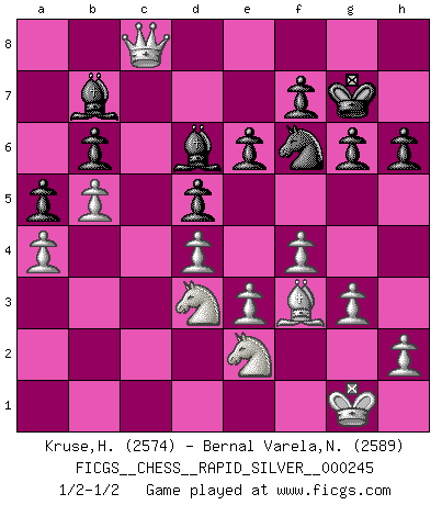 Last move : 1/2-1/2 2019 July 3 7:6:40 [Event "FICGS__CHESS__RAPID_SILVER__000245"] [Site "FICGS"] [Date "2019.04.10"] [Round "1"] [White "Kruse,Herbert"] [Black "Bernal Varela,Nelson"] [Result "1/2-1/2"] [WhiteElo "2574"] [BlackElo "2589"] 1.Nf3 d5 2.d4 Nf6 3.c4 e6 4.g3 Bb4+ 5.Bd2 Be7 6.Bg2 O-O 7.O-O c6 8.a4 b6 9.b4 Bb7 10.Qc2 Ne4 11.Rc1 Nxd2 12.Qxd2 a5 13.b5 cxb5 14.cxb5 Bb4 15.Nc3 Nd7 16.Ne1 Rc8 17.Nd3 Be7 18.e3 Rc4 19.Nb2 Rc7 20.Ne2 g6 21.Nd3 Bd6 22.Ra2 Kg7 23.Rac2 Rxc2 24.Rxc2 Qb8 25.Qc1 Nf6 26.f4 h6 27.Bf3 Rc8 28.Rxc8 Qxc8 29.Qxc8 1/2-1/2 Reti Opening Kingside Castling by player Black (move 6) Kingside Castling by player White (move 7) This chess game ended in a draw. Follow this game move after move (download)I am still a victim of Chess. It has all the beauty of art and much more. It cannot be commercialized. Chess is much purer than art in its social position. (Marcel Duchamp) Wenn ich mich einlogge, glauben die Leute gewöhnlich nicht, dass ich es selbst bin und sie fangen an, mir dumme Fragen zu stellen. Und wenn sie es glauben, stellen sie wieder andere dumme Fragen. (Judith Polgar) En el tablero, la mentira e hipocresía no sobreviven mucho. (Emanuel Lasker) Fischer est le meilleur joueur du monde et Karpov n'est qu'un joueur de bistrot. (Garry Kasparov, agé de 16 ans) Knowledge rests not upon truth alone, but upon error also. (Carl G. Jung)