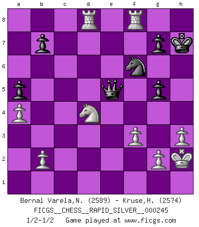 Last move : 1/2-1/2 2019 July 2 6:40:10 [Event "FICGS__CHESS__RAPID_SILVER__000245"] [Site "FICGS"] [Date "2019.04.10"] [Round "2"] [White "Bernal Varela,Nelson"] [Black "Kruse,Herbert"] [Result "1/2-1/2"] [WhiteElo "2589"] [BlackElo "2574"] 1.e4 e5 2.Nf3 Nc6 3.Bb5 Nf6 4.d3 Bc5 5.c3 O-O 6.O-O d6 7.h3 Bb6 8.Re1 Ne7 9.d4 d5 10.Nxe5 Nxe4 11.Nd2 Nd6 12.Bd3 c6 13.Qc2 Bf5 14.Ndf3 Bxd3 15.Nxd3 Ng6 16.Nde5 Ne4 17.Nxg6 hxg6 18.Bf4 Re8 19.a4 Rc8 20.Re2 Bc7 21.Be5 Bxe5 22.dxe5 a5 23.Nd4 Qc7 24.Rae1 Re7 25.e6 f5 26.Qc1 Rf8 27.Qe3 c5 28.Nb5 Qc6 29.Kh2 Rfe8 30.f3 Nf6 31.Qe5 Rxe6 32.Qxe6+ Rxe6 33.Rxe6 Qc8 34.R1e5 Kh7 35.Rd6 Qf8 36.Kg1 Qf7 37.Kh2 Nh5 38.Rd8 d4 39.R5e8 g5 40.Rf8 Qb3 41.cxd4 Nf6 42.Nd6 cxd4 43.Nxf5 Qe6 44.Nxd4 Qe5+ 45.Kg1 Qe1+ 46.Kh2 Qe5+ 47.Kg1 Qe1+ 48.Kh2 Qe5+ 1/2-1/2 Ruy Lopez : Berlin defense Kingside Castling by player Black (move 5) Kingside Castling by player White (move 6) This chess game ended in a draw. Follow this game move after move (download)Fischer sacrificed virtually everything most of us weakies (to use his term) value, respect, and cherish, for the sake of an artful, often beautiful board game, for the ambivalent privilege of being its greatest master. (Paul Kollar) Ich las kürzlich ein Buch von Nietzsche. Er sagte Religion verdumme nur die Menschen. Ich stimme zu. (Robert James Fischer) El juego de Damas es para vagabundos. (Paul Morphy) Avec des compensations pour le matériel en plus... (Anonyme) If you don't practice you don't deserve to win. (Andre Agassi)