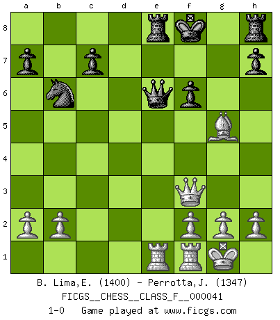 Last move : 1-0 2007 August 13 1:26:47 [Event "FICGS__CHESS__CLASS_F__000041"] [Site "FICGS"] [Date "2007.06.09"] [Round "1"] [White "B. Lima,Edmilson"] [Black "Perrotta,John Zach"] [Result "1-0"] [WhiteElo "1400"] [BlackElo "1347"] 1.d4 d5 2.c4 dxc4 3.e3 e5 4.Bxc4 exd4 5.exd4 Nf6 6.Nc3 Be7 7.Nf3 Bg4 8.Bxf7+ Kxf7 9.Ne5+ Kf8 10.Nxg4 Nbd7 11.Qf3 Nb6 12.Nxf6 Bxf6 13.Qxb7 Bxd4 14.O-O Qc8 15.Qf3+ Bf6 16.Bg5 Qe6 17.Ne4 Re8 18.Nxf6 gxf6 19.Rae1 1-0 Queen's gambit accepted Kingside Castling by player White (move 14) Player White won this chess game. Follow this game move after move (download)Chess is a part of culture and if a culture is declining then Chess too will decline. (Mikhail Botvinnik) Jeder Fehler erscheint unglaublich dumm, wenn andre ihn begehen. (Georg Christoph Lichtenberg) Un mal día en el Ajedrez, es mejor que cualquier buen día en el trabajo. (Anonymous) Les échecs sont utiles à l'exercice de la faculté de penser et à celle de l'imagination. Car nous devons posséder une méthode élaborée pour atteindre des buts partout où nous devons conduire notre raison. (Leibnitz) History is a gallery of pictures in which there are few originals and many copies. (Alexis de Tocqueville)