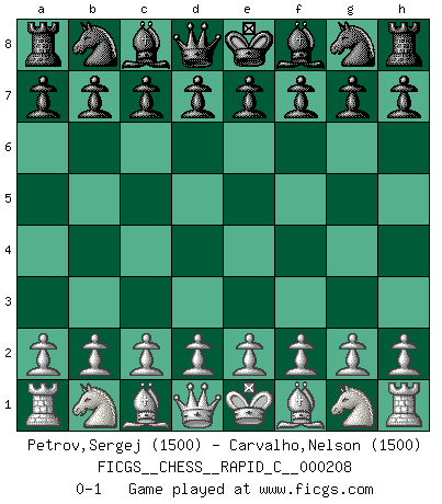 Last move : 0-1 2019 May 12 20:20:30 [Event "FICGS__CHESS__RAPID_C__000208"] [Site "FICGS"] [Date "2019.04.12"] [Round "1"] [White "Petrov,Sergej"] [Black "Carvalho,Nelson"] [Result "0-1"] [WhiteElo "1500"] [BlackElo "1500"] 0-1 This chess game has been lost on time (started : 2019.04.12 9:14:11) Player Black won this chess game. Follow this game move after move (download)Dazzling combinations are for the many, shifting wood is for the few. (Georg Kieninger) Fischer ist das größte Genie, das je vom Schachhimmel heruntergestiegen ist. (Mikhail Nekhemyevich Tal) Si un gobernante no entiende al Ajedrez, ¿como puede governar él un reinado?. (El Rey Khusros II) Les échecs c'est le défi de l'alpiniste, toujours plus haut, prêt à tout pour monter à l'assaut du Roi ennemi. Les échecs, c'est de la musique en mouvement, un ballet majestueux pour les yeux. C'est de la poésie composée par les fantômes du passé qui au même titre que Rimbaud ou Verlaine méritent notre admiration. Les échecs, c'est de la peinture ou le moindre mouvement modifie le tableau pour en faire un Picasso ou un Van Gogh. Les échecs, c'est tout et rien, c'est la vie et la mort. Jjulie33 sur le forum de France-Echecs. If computers get too powerful, we can organize them into committees. That'll do them in. (Anonymous)