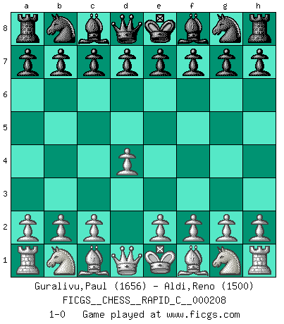 Last move : 1-0 2019 May 12 20:20:30 [Event "FICGS__CHESS__RAPID_C__000208"] [Site "FICGS"] [Date "2019.04.12"] [Round "1"] [White "Guralivu,Paul"] [Black "Aldi,Reno"] [Result "1-0"] [WhiteElo "1656"] [BlackElo "1500"] 1.d4 1-0 This chess game has been lost on time (started : 2019.04.12 9:14:11) Queen's pawn Player White won this chess game. Follow this game move after move (download)The only thing Chess players have in common is Chess. (Lodewijk Prins) Ivan Sokolov treibt mich als Beifahrer an mit go Loeky go - . (Loek van Wely) Un entendimiento a fondo de las continuaciones típicas del mate, hace de las combinaciones de sacrificio mas complicadas conducirlas a ellas no solo sin dificultad, sino casi de una manera natural. (Siegbert Tarrasch) Je ne suis pas le dernier à jouer lâchement des coups douteux pendant le zeïtnot de l'adversaire pour l'achever: en effet les coups qui font le plus peur sont ceux que l'on ne comprend pas. Je me fais souvent peur quand je joue. (Un professeur anonyme) Live, lose, and learn, by observing your opponent how to win. (Amber Steenbock)