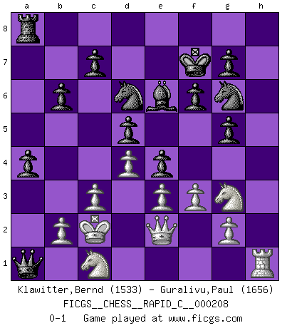 Last move : 0-1 2019 May 4 5:19:56 [Event "FICGS__CHESS__RAPID_C__000208"] [Site "FICGS"] [Date "2019.04.12"] [Round "1"] [White "Klawitter,Bernd"] [Black "Guralivu,Paul"] [Result "0-1"] [WhiteElo "1533"] [BlackElo "1656"] 1.d4 d5 2.Bf4 Bf5 3.e3 Nf6 4.Nd2 e6 5.c3 Bd6 6.Bg3 O-O 7.Ne2 Nc6 8.Nc1 e5 9.Bd3 e4 10.Be2 a5 11.a4 Bxg3 12.hxg3 Qd7 13.Nf1 h6 14.Nh2 Be6 15.Nb3 b6 16.g4 Ne8 17.Nf1 Nd6 18.Ng3 Ne7 19.g5 hxg5 20.Bb5 Nxb5 21.Qh5 f6 22.Qh7+ Kf7 23.Qh5+ Ng6 24.Qe2 Nd6 25.Kd2 Rh8 26.f3 Rxh1 27.Rxh1 Qxa4 28.Nc1 Qa1 29.Kc2 a4 0-1 Queen's pawn, Mason variation Kingside Castling by player Black (move 6) Player Black won this chess game. Follow this game move after move (download)Human affairs are like a Chess game: only those who do not take it seriously can be called good players. (Hung Tzu Ch'eng) Matt entspricht nicht immer den Tatsachen. (Savielly Grigorievitsch Tartakower) Una victoria por una combinación errónea, aunque sea espectacular, me llena de horror artístico. (Wilhelm Steinitz) Tout change constamment, y compris dans le monde des Echecs. (Botvinnik) Do you know these so called Volunteers don't even get paid! (Simpsons)