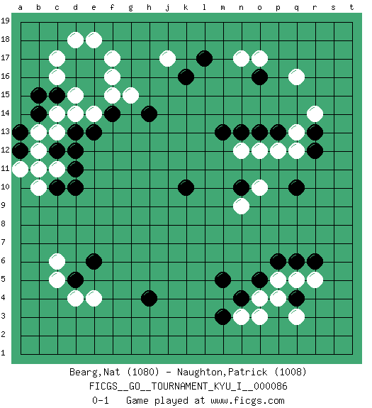 Last move : 0-1 2019 July 11 3:30:25 [Event "FICGS__GO__TOURNAMENT_KYU_I__000086 "] [Site "FICGS"] [Date "2019.04.15"] [Round "1"] [Black "Bearg,Nat "] [White "Naughton,Patrick "] [Result "0-1"] [Rating 1 "1080"] [Rating 2 "1008"] 1.d16 q16 2.q4 d4 3.k10 f17 4.o16 o17 5.d5 e4 6.h4 c5 7.d10 c6 8.e6 n17 9.q10 q13 10.k16 j17 11.l17 g15 12.e17 f16 13.e15 d14 14.c15 e14 15.f14 f15 16.e13 c14 17.d13 c13 18.c12 d15 19.e16 c16 20.b15 e18 21.d17 c17 22.b14 b13 23.a13 b12 24.b11 d18 25.a12 c11 26.d12 b10 27.c10 a11 28.d11 b11 29.h14 o3 30.n4 n3 31.m3 o4 32.o5 p5 33.m5 p4 34.p6 q5 35.q6 r5 36.r6 q3 37.r13 r14 38.p13 q12 39.r12 p12 40.o13 o12 41.n13 n12 42.m13 n9 43.n10 o10 0-1 This go game has been lost on time (started : 2019.04.15 7:57:3) Here are the names of the openings (joseki) played in the four corners : Corner d16 : d16 f17Hoshi (Hwajeom, Seongjeom, Xingwei`) 4-4 Point. The star or hoshi (4-4) point, emphasizing influence at the potential expense of territory.Ikken Kakari (Hankan Keolch'im, Yi Gua`jiao~, 1-Space Low Approach). White 2 is the standard approach move to the 4-4. Corner q16 : q16 o16Hoshi (Hwajeom, Seongjeom, Xingwei`) 4-4 Point. The star or hoshi (4-4) point, emphasizing influence at the potential expense of territory.Ikken Takagakari (Hankan Nop'dakeolch'im, Yi Gaojia, 1-Space High Approach). White typically responds at 6-4 or 3-10. White 4-10 is played when White finds play on the right side advantageous. White 4-8 or 3-8 may be played when White has support at top. Corner d4 : d4 d5Hoshi (Hwajeom, Seongjeom, Xingwei`) 4-4 Point. The star or hoshi (4-4) point, emphasizing influence at the potential expense of territory. Corner q4 : q4 o3Hoshi (Hwajeom, Seongjeom, Xingwei`) 4-4 Point. The star or hoshi (4-4) point, emphasizing influence at the potential expense of territory.Ikken Kakari (Hankan Keolch'im, Yi Gua`jiao~, 1-Space Low Approach). White 2 is the standard approach move to the 4-4. Player White won this Go (weiqi, baduk) game.Follow this game move after move (download ) Answer the keima with a kosumi. (Anonymous) Whoever said the pen is mightier than the sword obviously never encountered automatic weapons. (US General Douglas MacArthur)