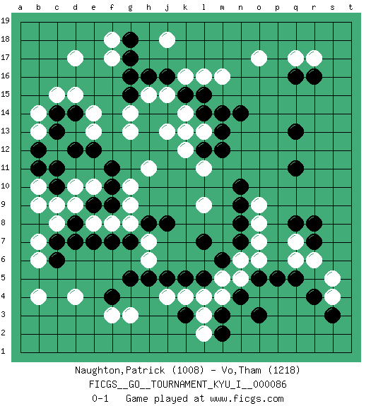 Last move : 0-1 2019 April 27 14:26:28 [Event "FICGS__GO__TOURNAMENT_KYU_I__000086 "] [Site "FICGS"] [Date "2019.04.15"] [Round "1"] [Black "Naughton,Patrick "] [White "Vo,Tham "] [Result "0-1"] [Rating 1 "1008"] [Rating 2 "1218"] 1.q16 d4 2.r4 d17 3.o3 o17 4.q13 k16 5.d14 c15 6.c14 d15 7.c10 e14 8.d12 e13 9.c6 f3 10.k3 b4 11.q8 c8 12.e7 e8 13.f7 f8 14.g7 g8 15.f11 h7 16.g5 h6 17.f4 g3 18.h5 j4 19.j5 k4 20.k5 l4 21.l5 m4 22.m2 l2 23.m3 l3 24.n4 m5 25.l7 h11 26.e12 g13 27.m6 n5 28.o5 n6 29.n7 o6 30.p5 o7 31.n8 o8 32.n9 o9 33.n10 q7 34.r7 q6 35.q5 r6 36.r8 s4 37.s3 s5 38.q11 r17 39.r16 q17 40.j16 j15 41.k15 l16 42.h16 h15 43.g16 f17 44.g15 g14 45.g17 f18 46.g18 j18 47.l15 m16 48.k13 j13 49.m13 k12 50.l12 k14 51.l14 l13 52.n14 k13 53.m14 l11 54.m12 l9 55.h8 g10 56.j8 b6 57.c7 b7 58.d8 d9 59.d7 c9 60.e9 e10 61.f9 g9 62.f10 d10 63.c11 b14 64.c13 b13 65.b12 b10 66.b11 b9 0-1 Here are the names of the openings (joseki) played in the four corners : Corner q16 : q16 o17Hoshi (Hwajeom, Seongjeom, Xingwei`) 4-4 Point. The star or hoshi (4-4) point, emphasizing influence at the potential expense of territory.Ikken Kakari (Hankan Keolch'im, Yi Gua`jiao~, 1-Space Low Approach). White 2 is the standard approach move to the 4-4. Corner d16 : d17 d14Komoku (Somok, Xiao~mu`) 3-4 Point. The komoku (3-4) point is the traditional corner enclosure move..Niken Takagakari (Dukan Nop'dakeolch'im, E`r Gaojia, 2-Space High Approch). The great master Honinbo Shuei (1852-1906) favored the two-space high (niken taka-gakari) approach, especially in two stone handicap games. This approach move was very popular in the 1910s. Wu Qingyuan = Go Seigen frequently played this way, considering it a good "whole board" approach. In recent years, O Rissei has often used the two-space high approach. Corner d4 : d4 c6Hoshi (Hwajeom, Seongjeom, Xingwei`) 4-4 Point. The star or hoshi (4-4) point, emphasizing influence at the potential expense of territory.Ikken Kakari (Hankan Keolch'im, Yi Gua`jiao~, 1-Space Low Approach). Black 2 is the standard approach move to the 4-4. Player White won this Go (weiqi, baduk) game.Follow this game move after move (download ) You can hide nothing on the goban. (Pierre Audouard) Life is verb, not a noun. (Charlotte Perkins Gilman)