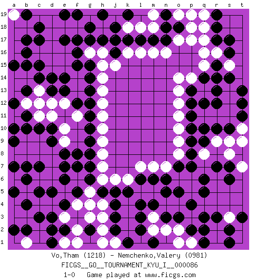 Last move : 1-0 2019 July 1 16:29:23 [Event "FICGS__GO__TOURNAMENT_KYU_I__000086"] [Site "FICGS"] [Date "2019.04.15"] [Round "1"] [Black "Vo,Tham"] [White "Nemchenko,Valery"] [Result "1-0"] [Rating 1 "1218"] [Rating 2 "0981"] 1.q3 q16 2.d3 d16 3.r14 q15 4.q14 p14 5.p13 o14 6.s16 o13 7.p12 o12 8.p11 o11 9.p10 o10 10.p9 o9 11.p8 o8 12.o7 n7 13.n6 m7 14.m6 l7 15.l6 k6 16.k5 j6 17.j5 h6 18.h5 g5 19.g6 f6 20.g7 h7 21.g8 h8 22.g9 h9 23.g10 h10 24.g11 h11 25.g12 h12 26.g14 h13 27.e14 h14 28.g15 h15 29.g17 h16 30.h17 j17 31.j18 k18 32.k17 l18 33.j16 k16 34.l17 l16 35.m17 m16 36.n17 n16 37.c5 o17 38.o18 p17 39.c14 j15 40.j17 g4 41.j3 h4 42.j4 h3 43.j2 h2 44.f3 f4 45.e4 e5 46.d5 d6 47.e7 d7 48.e6 f7 49.e8 d8 50.d9 e9 51.f8 c9 52.d10 c8 53.c10 e10 54.b10 b9 55.b7 c6 56.b6 b5 57.b4 j1 58.k1 h1 59.l2 g16 60.f16 p18 61.n18 m18 62.e17 o19 63.n19 p19 64.r17 q17 65.r18 q18 66.r19 q19 67.p7 o6 68.o5 p6 69.q6 p5 70.p4 o4 71.q5 l5 72.l4 m5 73.m4 n4 74.n5 m3 75.l3 m2 76.n3 n2 77.o3 o2 78.p2 p1 79.q1 o1 80.m1 f2 81.e2 f1 82.g2 g3 83.f5 e3 84.d2 b3 85.c3 a4 86.a5 a3 87.b2 r1 88.q2 r2 89.r3 s3 90.s2 t2 91.s1 t1 92.t3 d17 93.b17 e18 94.c18 e16 95.f17 d18 96.c15 c16 97.b16 e15 98.f15 d15 99.d14 c19 100.r15 r16 101.s17 b18 102.c17 a17 103.b15 m19 104.k19 j19 105.g13 b1 106.a2 b8 107.a9 a8 108.a10 d11 109.a7 c11 110.c7 f18 111.g18 g19 112.h19 a16 113.a15 a18 114.b19 a19 115.b19 d19 116.f19 a19 117.e19 e12 118.f12 f11 119.b11 b12 120.b13 c13 121.a12 c12 122.d13 d12 123.e13 e1 124.d1 q13 125.r13 s15 126.s14 r9 127.s10 s9 128.r10 t10 129.t11 t9 130.s7 t7 131.s6 s8 132.q9 q8 133.r7 s11 134.t12 s12 135.t13 r11 136.q10 q11 137.q12 s13 138.r12 f6 139.f7 1-0 Here are the names of the openings (joseki) played in the four corners : Corner q16 : q16 r14 Hoshi (Hwajeom, Seongjeom, Xingwei`) 4-4 Point. The star or hoshi (4-4) point, emphasizing influence at the potential expense of territory. Ikken Kakari (Hankan Keolch'im, Yi Gua`jiao~, 1-Space Low Approach). Black 2 is the standard approach move to the 4-4. Corner d4 : d3 j6 Komoku (Somok, Xiao~mu`) 3-4 Point. The komoku (3-4) point is the traditional corner enclosure move.. Corner d16 : d16 g11 Hoshi (Hwajeom, Seongjeom, Xingwei`) 4-4 Point. The star or hoshi (4-4) point, emphasizing influence at the potential expense of territory. Player Black won this Go (weiqi, baduk) game. Follow this game move after move (download)Use a wall to attack, not to make territory. (Anonymous) It's not a bug - it's an undocumented feature. (Anonymous)