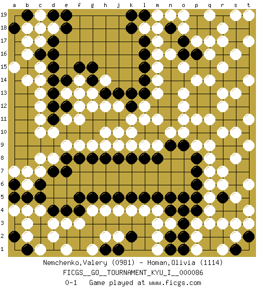 Last move : 0-1 2019 July 1 16:31:14 [Event "FICGS__GO__TOURNAMENT_KYU_I__000086"] [Site "FICGS"] [Date "2019.04.15"] [Round "1"] [Black "Nemchenko,Valery"] [White "Homan,Olivia"] [Result "0-1"] [Rating 1 "0981"] [Rating 2 "1114"] 1.d4 q16 2.d16 q4 3.o5 q6 4.p6 q7 5.p7 q8 6.p8 p9 7.o9 o10 8.n9 n10 9.m10 m9 10.m8 l9 11.l8 k9 12.k8 j9 13.j8 h9 14.h8 g9 15.g8 f3 16.f4 g4 17.f5 e3 18.e4 d3 19.g5 h4 20.h5 j4 21.j5 k4 22.k5 m11 23.l10 k11 24.p10 q9 25.n11 o11 26.n12 o12 27.l11 l12 28.m12 k10 29.k12 m11 30.l13 l11 31.j13 m13 32.n13 m14 33.l14 m15 34.l15 m16 35.l16 m17 36.l17 r17 37.o4 p3 38.o3 p2 39.o2 c14 40.d15 b16 41.d14 c13 42.d13 c17 43.d17 l18 44.k18 m18 45.l19 m19 46.k19 l4 47.l5 m4 48.m5 g13 49.j11 h12 50.h13 g12 51.g14 f14 52.f13 h14 53.g15 j12 54.k13 d18 55.e18 c18 56.d19 c19 57.e19 c11 58.d12 c10 59.d11 d10 60.e10 e9 61.f10 f9 62.g10 f12 63.h11 e13 64.f15 e11 65.e12 f11 66.e14 h10 67.g11 j10 68.f8 c4 69.c5 b4 70.b5 c7 71.e8 d8 72.e7 m2 73.n5 p1 74.o1 b6 75.a6 a7 76.a5 a4 77.c6 b7 78.d7 c8 79.n14 o15 80.n15 n16 81.o14 p14 82.o16 o13 83.p5 q5 84.p4 q3 85.c3 b3 86.c2 b2 87.b1 d2 88.d1 c1 89.c2 e1 90.n2 m1 91.n1 n3 92.n4 m3 93.c3 c1 94.q10 r10 95.r11 s10 96.s11 q11 97.q12 p11 98.p12 f13 99.p13 r12 100.q13 r13 101.s12 s13 102.t13 c15 103.c16 b17 104.r14 q14 105.s14 r15 106.s15 s16 107.t16 t17 108.t15 t14 109.t12 t11 110.a2 c12 111.r2 r3 112.q2 s2 113.s1 s3 114.t2 t3 115.q1 r1 116.o17 o18 117.p18 o19 118.p19 p17 119.n18 n19 120.p16 q17 121.q18 r18 122.r19 q19 123.b15 b14 124.s7 s8 125.t8 t9 126.t7 r7 127.s6 s5 128.t5 t4 129.r5 t6 130.s18 r6 131.t18 s19 132.b19 b18 133.a18 a15 134.s17 t19 135.k2 j2 136.j1 h2 137.h1 g1 0-1 Here are the names of the openings (joseki) played in the four corners : Corner q4 : q4 o5 Hoshi (Hwajeom, Seongjeom, Xingwei`) 4-4 Point. The star or hoshi (4-4) point, emphasizing influence at the potential expense of territory. Corner d4 : d4 j9 Hoshi (Hwajeom, Seongjeom, Xingwei`) 4-4 Point. The star or hoshi (4-4) point, emphasizing influence at the potential expense of territory. Player White won this Go (weiqi, baduk) game. Follow this game move after move (download)Atari, atari is vulgar play. (Anonymous) Nothing is more important for teaching us to understand the concepts we have than constructing fictitious ones. (Ludwig Wittgenstein)