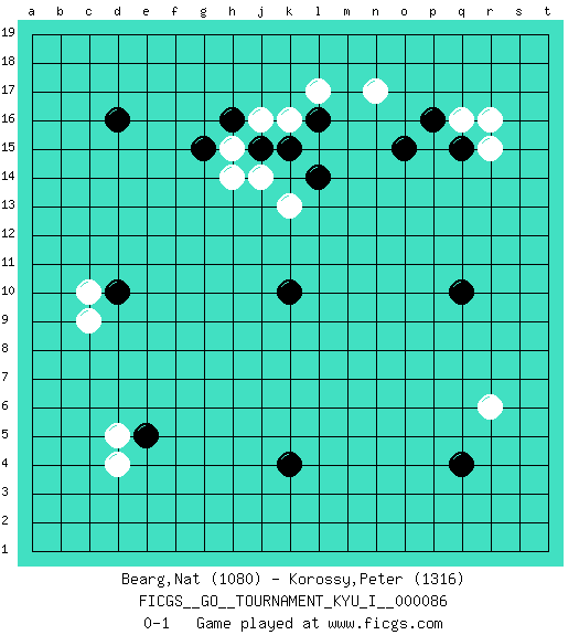 Last move : 0-1 2019 June 23 8:2:56 [Event "FICGS__GO__TOURNAMENT_KYU_I__000086"] [Site "FICGS"] [Date "2019.04.15"] [Round "1"] [Black "Bearg,Nat"] [White "Korossy,Peter"] [Result "0-1"] [Rating 1 "1080"] [Rating 2 "1316"] 1.d16 d4 2.q4 q16 3.k10 c10 4.k4 r6 5.q10 k16 6.d10 c9 7.e5 d5 8.q15 r16 9.p16 r15 10.o15 n17 11.k15 k13 12.l14 j14 13.j15 j16 14.h16 h15 15.g15 h14 16.l16 l17 0-1 This go game has been lost on time (started : 2019.04.15 7:57:3) Here are the names of the openings (joseki) played in the four corners : Corner q4 : q4 r6 Hoshi (Hwajeom, Seongjeom, Xingwei`) 4-4 Point. The star or hoshi (4-4) point, emphasizing influence at the potential expense of territory. Ikken Kakari (Hankan Keolch'im, Yi Gua`jiao~, 1-Space Low Approach). White 2 is the standard approach move to the 4-4. Corner q16 : q16 q15 Hoshi (Hwajeom, Seongjeom, Xingwei`) 4-4 Point. The star or hoshi (4-4) point, emphasizing influence at the potential expense of territory. Corner d16 : d16 j14 Hoshi (Hwajeom, Seongjeom, Xingwei`) 4-4 Point. The star or hoshi (4-4) point, emphasizing influence at the potential expense of territory. Player White won this Go (weiqi, baduk) game. Follow this game move after move (download)There is no territory in the centre. (Anonymous) In God we trust, all others we virus scan. (Anonymous)