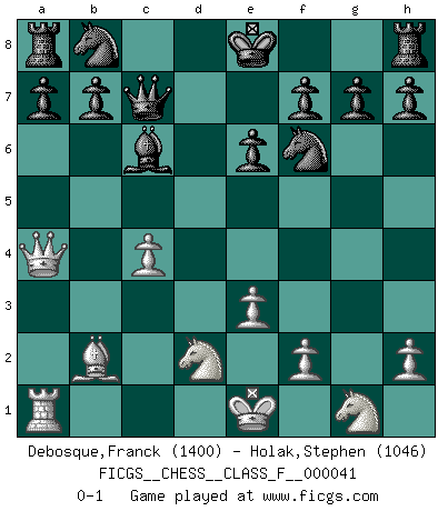 Last move : 0-1 2007 September 6 19:22:23 [Event "FICGS__CHESS__CLASS_F__000041"] [Site "FICGS"] [Date "2007.06.09"] [Round "1"] [White "Debosque,Franck"] [Black "Holak,Stephen"] [Result "0-1"] [WhiteElo "1400"] [BlackElo "1046"] 1.b3 d5 2.Bb2 Nf6 3.e3 Bf5 4.d3 e6 5.c4 Bb4+ 6.Nd2 dxc4 7.bxc4 Bxd3 8.a3 Bxf1 9.axb4 Bxg2 10.Qa4+ Bc6 11.b5 Bxh1 12.b6 Bc6 13.bxc7 Qxc7 0-1 Nimzovich-Larsen attack : Classical variation Player Black won this chess game. Follow this game move after move (download)Chess is a terrible game. If you have no center, your opponent has a freer position. If you do have a center, then you really have something to worry about ! (Siegbert Tarrasch) Alle offensichtlichen Züge sehen nach dem Spiel in der Analyse verdächtig aus. (Viktor Kortschnoi) En posiciones complicadas, Bobby Fischer pocas veces tuvo que temer de cualquiera. (Paul Keres) Les échecs c'est le défi de l'alpiniste, toujours plus haut, prêt à tout pour monter à l'assaut du Roi ennemi. Les échecs, c'est de la musique en mouvement, un ballet majestueux pour les yeux. C'est de la poésie composée par les fantômes du passé qui au même titre que Rimbaud ou Verlaine méritent notre admiration. Les échecs, c'est de la peinture ou le moindre mouvement modifie le tableau pour en faire un Picasso ou un Van Gogh. Les échecs, c'est tout et rien, c'est la vie et la mort. Jjulie33 sur le forum de France-Echecs. I know the human being and fish can coexist peacefully. (George W. Bush, Saginaw sept. 29, 2000)