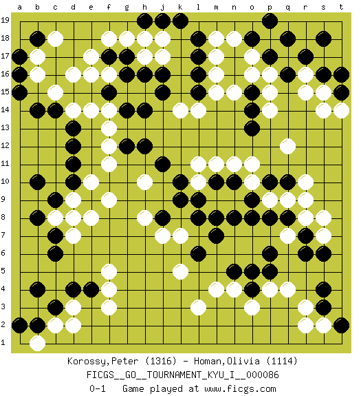 Last move : 0-1 2019 July 28 8:0:51 [Event "FICGS__GO__TOURNAMENT_KYU_I__000086"] [Site "FICGS"] [Date "2019.04.15"] [Round "1"] [Black "Korossy,Peter"] [White "Homan,Olivia"] [Result "0-1"] [Rating 1 "1316"] [Rating 2 "1114"] 1.q16 d16 2.d4 q4 3.r6 o3 4.s4 r3 5.s3 l3 6.q10 o17 7.n16 o16 8.o15 n15 9.n17 p15 10.o14 p16 11.r17 m15 12.l17 p14 13.o13 r15 14.s16 s15 15.q18 q12 16.o18 p18 17.p19 n18 18.p17 m17 19.l16 m16 20.g17 e17 21.c14 d14 22.d13 e14 23.d12 c15 24.b14 j17 25.j16 h17 26.h16 g18 27.l15 l14 28.h14 k14 29.j15 f13 30.h12 f11 31.g12 f12 32.d10 h10 33.j11 l11 34.k10 l10 35.k9 f9 36.l9 m9 37.m8 n9 38.m7 k7 39.l8 r8 40.q8 q7 41.r7 q9 42.p8 p9 43.o8 r9 44.p6 f3 45.c6 d2 46.c3 c2 47.b2 f5 48.j8 j7 49.a17 b16 50.a16 b17 51.a15 c8 52.d8 d7 53.c7 d9 54.c9 e8 55.b8 d8 56.b10 s2 57.t2 r2 58.n5 m4 59.l6 k5 60.o4 p4 61.p5 n4 62.o5 h8 63.f17 f18 64.f15 f14 65.e4 f4 66.o9 o10 67.p10 r10 68.n10 o11 69.m10 n11 70.n8 m11 71.b18 c18 72.t15 t14 73.t16 s14 74.l18 r16 75.s18 b1 76.a2 d3 77.b4 e10 78.d11 s7 79.s6 s8 80.j19 f16 81.g16 e16 82.g14 j18 83.h19 h18 84.k19 m18 0-1 Here are the names of the openings (joseki) played in the four corners : Corner q4 : q4 r6 Hoshi (Hwajeom, Seongjeom, Xingwei`) 4-4 Point. The star or hoshi (4-4) point, emphasizing influence at the potential expense of territory. Ikken Kakari (Hankan Keolch'im, Yi Gua`jiao~, 1-Space Low Approach). Black 2 is the standard approach move to the 4-4. Corner q16 : q16 o17 Hoshi (Hwajeom, Seongjeom, Xingwei`) 4-4 Point. The star or hoshi (4-4) point, emphasizing influence at the potential expense of territory. Ikken Kakari (Hankan Keolch'im, Yi Gua`jiao~, 1-Space Low Approach). White 2 is the standard approach move to the 4-4. Corner d16 : d16 g17 Hoshi (Hwajeom, Seongjeom, Xingwei`) 4-4 Point. The star or hoshi (4-4) point, emphasizing influence at the potential expense of territory. Niken Kakari (Dukan Keolch'im, E`r Gua`jiao~, 2-Space Low Approach). White typically answers by 7-3 or 3-5 (which is not joseki). Corner d4 : d4 f9 Hoshi (Hwajeom, Seongjeom, Xingwei`) 4-4 Point. The star or hoshi (4-4) point, emphasizing influence at the potential expense of territory. Player White won this Go (weiqi, baduk) game. Follow this game move after move (download)In the opening, when you don't know what to play, make a shimari. (Jansteen) Always be a first-rate version of yourself, instead of a second-rate version of somebody else. (Judy Garland)