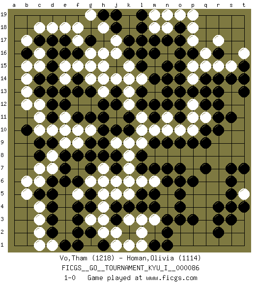 Last move : 1-0 2019 August 8 21:27:23 [Event "FICGS__GO__TOURNAMENT_KYU_I__000086"] [Site "FICGS"] [Date "2019.04.15"] [Round "1"] [Black "Vo,Tham"] [White "Homan,Olivia"] [Result "1-0"] [Rating 1 "1218"] [Rating 2 "1114"] 1.d4 q16 2.d16 q4 3.o3 r6 4.k4 c6 5.c8 c3 6.d3 c4 7.d5 b6 8.e7 f17 9.d14 d18 10.c17 j17 11.r14 s15 12.o17 p17 13.o16 p14 14.l17 q11 15.p13 q13 16.q14 p15 17.q12 p12 18.r13 o13 19.r11 q13 20.r12 r9 21.q10 p11 22.r10 p18 23.r8 k15 24.l15 l14 25.k16 j16 26.m14 m15 27.l16 k14 28.n15 m13 29.n14 s9 30.q9 s8 31.o9 n18 32.o18 o19 33.n17 c12 34.e12 m18 35.m16 c10 36.c9 e11 37.f11 e10 38.d12 f10 39.g11 g10 40.h11 d7 41.e8 d8 42.d9 e9 43.d6 c7 44.g8 q2 45.b10 c11 46.h10 m3 47.m4 l3 48.l4 k3 49.j3 j2 50.n3 h3 51.j4 l2 52.g2 h2 53.n2 h4 54.f3 h6 55.j7 f5 56.f6 j6 57.k6 g6 58.f4 f7 59.e6 n4 60.o5 n5 61.n6 k7 62.l7 k8 63.j8 l6 64.m5 k5 65.l8 k9 66.s6 r7 67.r3 q3 68.r4 r5 69.s5 s2 70.r2 r1 71.s3 t3 72.s4 b14 73.s7 q8 74.q5 p5 75.p6 q6 76.l12 l9 77.m9 m10 78.n9 l11 79.m12 k12 80.n13 p7 81.o6 c15 82.f16 g16 83.e17 e18 84.g17 f18 85.g15 h16 86.h14 n11 87.r16 r17 88.p16 q15 89.l13 k13 90.n12 c2 91.g7 r15 92.l18 f15 93.e16 g14 94.f14 h15 95.g13 g15 96.b16 e14 97.f13 e15 98.d15 d13 99.c14 b15 100.c13 b13 101.e13 c16 102.d17 b17 103.j12 c18 104.d13 m6 105.n7 o8 106.m7 n8 107.o11 m8 108.k11 o10 109.p9 p8 110.o12 n10 111.p13 p10 112.o14 j5 113.o4 p2 114.m1 l1 115.g5 h13 116.h12 j14 117.k10 l10 118.j18 h18 119.n19 m19 120.m17 o2 121.h1 j1 122.k2 g1 123.f1 k1 124.g4 h5 125.s14 p19 126.l19 n19 127.d2 s10 128.s11 j9 129.h9 d1 130.t10 t9 131.e1 c1 132.j13 h14 133.t15 t16 134.m11 t11 135.j10 k6 136.j19 t14 137.t13 t12 138.t15 p4 139.t14 s12 140.h19 g19 141.c5 b5 142.d11 d10 143.k17 t10 144.o13 o1 145.s1 t1 146.q1 p1 147.t4 q1 148.t2 s1 149.t7 t3 150.n1 g3 151.f2 t2 152.g9 h7 153.h8 f9 154.f8 b12 155.h1 r8 156.o15 s13 157.q13 g1 158.l5 pass 159.h1 t8 160.p3 q5 161.o7 t5 162.q7 1-0 Here are the names of the openings (joseki) played in the four corners : Corner q4 : q4 o3 Hoshi (Hwajeom, Seongjeom, Xingwei`) 4-4 Point. The star or hoshi (4-4) point, emphasizing influence at the potential expense of territory. Ikken Kakari (Hankan Keolch'im, Yi Gua`jiao~, 1-Space Low Approach). Black 2 is the standard approach move to the 4-4. Corner d4 : d4 c6 Hoshi (Hwajeom, Seongjeom, Xingwei`) 4-4 Point. The star or hoshi (4-4) point, emphasizing influence at the potential expense of territory. Ikken Kakari (Hankan Keolch'im, Yi Gua`jiao~, 1-Space Low Approach). White 2 is the standard approach move to the 4-4. Corner d16 : d16 f17 Hoshi (Hwajeom, Seongjeom, Xingwei`) 4-4 Point. The star or hoshi (4-4) point, emphasizing influence at the potential expense of territory. Ikken Kakari (Hankan Keolch'im, Yi Gua`jiao~, 1-Space Low Approach). White 2 is the standard approach move to the 4-4. Corner q16 : q16 r14 Hoshi (Hwajeom, Seongjeom, Xingwei`) 4-4 Point. The star or hoshi (4-4) point, emphasizing influence at the potential expense of territory. Ikken Kakari (Hankan Keolch'im, Yi Gua`jiao~, 1-Space Low Approach). Black 2 is the standard approach move to the 4-4. Player Black won this Go (weiqi, baduk) game. Follow this game move after move (download)Don't disturb symmetry. (Anonymous) The hypothalamus is one of the most important parts of the brain, involved in many kinds of motivation, among other functions. The hypothalamus controls the 'Four Fs: Fighting, Fleeing, Feeding and Mating. (Unknown author)
