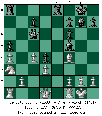 Last move : 1-0 2019 June 1 10:49:33 [Event "FICGS__CHESS__RAPID_D__000123"] [Site "FICGS"] [Date "2019.04.15"] [Round "1"] [White "Klawitter,Bernd"] [Black "Sharma,Vivek"] [Result "1-0"] [WhiteElo "1533"] [BlackElo "1471"] 1.e4 e5 2.Nf3 Nc6 3.Bb5 d5 4.Bxc6+ bxc6 5.Nxe5 Nf6 6.Nxc6 Qd6 7.e5 Qxc6 8.exf6 gxf6 9.d3 Bg7 10.O-O O-O 11.c3 Bf5 12.Bf4 a5 13.a4 d4 14.c4 Rfe8 15.Na3 1-0 This chess game has been lost on time (started : 2019.04.15 19:15:31) Ruy Lopez (Spanish Opening) Kingside Castling by player White (move 10) Kingside Castling by player Black (move 10) Player White won this chess game. Follow this game move after move (download)Fischer is completely natural. He plays no roles. He's like a child. Very, very simple. (Zita Rajcsanyi) Schach ist ein Reich, wo sich die menschliche Phantasie frei entfalten kann. (David Bronstein) No todos los artistas son jugadores de Ajedrez, pero todos los jugadores de Ajedrez son artistas. (Marcel Duchamp) Les échecs, c'est la lutte contre l'erreur. (Johannes Zukertort) Chess, like love, like music, has the power to make people happy. (Siegbert Tarrasch)