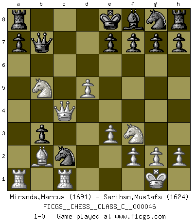 Last move : 1-0 2007 June 28 8:33:8 [Event "FICGS__CHESS__CLASS_C__000046"] [Site "FICGS"] [Date "2007.06.09"] [Round "1"] [White "Miranda,Marcus"] [Black "Sarihan,Mustafa"] [Result "1-0"] [WhiteElo "1691"] [BlackElo "1624"] 1.Nf3 d5 2.d4 c6 3.c4 dxc4 4.e3 b5 5.a4 Qc7 6.b3 cxb3 7.axb5 cxb5 8.Bxb5+ Bd7 9.Na3 Bxb5 10.Nxb5 Qc4 11.Qe2 Qc8 12.Bb2 Nc6 13.O-O Qb7 14.d5 Nb4 15.Rfc1 Nc2 16.Qc4 1-0 Reti Opening Kingside Castling by player White (move 13) Player White won this chess game. Follow this game move after move (download)Fischer is an American Chess tragedy on par with Morphy and Pillsbury. (Mig Greengard) Dein Körper muss in Topform sein. Dein Schach verfällt, wenn dein Körper verfällt. Der Körper kann nicht vom Geist getrennt werden. (Robert James Fischer) La partida mas dura de ganar es una partida ganada. (Emanuel Lasker) C'est la seule position que je connaisse où les deux camps sont mals. Propos prêtés à V. Anand. To steal ideas from one person is plagiarism. To steal from many is research. (Unknown)