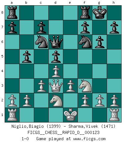 Last move : 1-0 2019 June 6 23:17:2 [Event "FICGS__CHESS__RAPID_D__000123"] [Site "FICGS"] [Date "2019.04.15"] [Round "1"] [White "Niglio,Biagio"] [Black "Sharma,Vivek"] [Result "1-0"] [WhiteElo "1399"] [BlackElo "1471"] 1.d4 d5 2.Nf3 Nc6 3.Bf4 Bf5 4.e3 e6 5.Bd3 Nf6 6.c3 Bd6 7.Bxd6 Qxd6 8.Bxf5 exf5 9.Nbd2 O-O 10.Qc2 b5 11.Qxf5 g6 12.Qd3 1-0 This chess game has been lost on time (started : 2019.04.15 19:15:31) Queen's pawn game, Chigorin variation Kingside Castling by player Black (move 9) Player White won this chess game. Follow this game move after move (download)I don't believe in psychology. I believe in good moves. (Bobby Fischer) Ein Kibitz ist einer, der deinem Gegner gute Ratschläge gibt. (Andrew Soltis) Una buena ofensiva y una buena defensa, comienzan ambas con un buen desarrollo. (Bruce A. Moon) Le génie consiste à savoir transgresser les règles au moment opportun. (Teichmann) Once you start thinking you have nothing left to learn, you have everything to learn. (Steve Badget)
