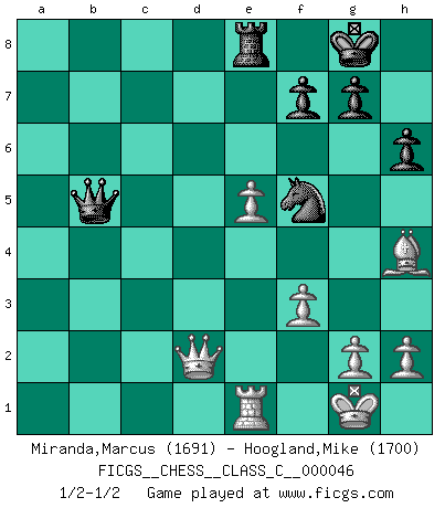 Last move : 1/2-1/2 2007 October 15 17:5:0 [Event "FICGS__CHESS__CLASS_C__000046"] [Site "FICGS"] [Date "2007.06.09"] [Round "1"] [White "Miranda,Marcus"] [Black "Hoogland,Mike"] [Result "1/2-1/2"] [WhiteElo "1691"] [BlackElo "1700"] 1.d4 Nf6 2.c4 e6 3.Nc3 Bb4 4.e3 O-O 5.Bd3 d5 6.Nf3 b6 7.O-O Bb7 8.cxd5 exd5 9.a3 Bd6 10.b4 Nbd7 11.Qb3 c6 12.e4 dxe4 13.Nxe4 Nxe4 14.Bxe4 Qc7 15.Bg5 h6 16.Bh4 a5 17.Rac1 axb4 18.axb4 Rfe8 19.Bd3 Nf8 20.Bc4 Ne6 21.Rfe1 Qd7 22.Ne5 Bxe5 23.dxe5 Nd4 24.Qc3 c5 25.bxc5 bxc5 26.f3 Ba6 27.Bxa6 Rxa6 28.Qxc5 Rc6 29.Qa3 Rxc1 30.Qxc1 Qb5 31.Qd2 Nf5 1/2-1/2 Nimzo-Indian : 4.e3 O-O, 5.Bd3 d5 Kingside Castling by player Black (move 4) Kingside Castling by player White (move 7) This chess game ended in a draw. Follow this game move after move (download)We cannot resist the fascination of sacrifice, since a passion for sacrifices is part of a Chessplayer's nature. (Rudolf Spielman) Im Blitz ist es einfacher mit einer Figur weniger anzugreifen, als sich mit einer Mehrfigur zu verteidigen. (Mikhail Nekhemyevich Tal) El Ajedrez es un juego de pelea el cual es puramente intelectual e incluye la suerte. (Richard Reti) Pour moi, les échecs ne sont pas un jeu mais un art. (Alexandre Alekhine) The man who strikes first admits that his ideas have given out. (Chinese proverb)