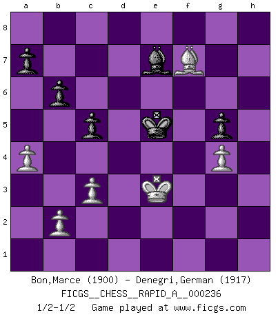 Last move : 1/2-1/2 2019 August 9 15:47:31 [Event "FICGS__CHESS__RAPID_A__000236"] [Site "FICGS"] [Date "2019.04.16"] [Round "1"] [White "Bon,Marce"] [Black "Denegri,German"] [Result "1/2-1/2"] [WhiteElo "1900"] [BlackElo "1917"] 1.e4 c6 2.d4 d5 3.Nc3 dxe4 4.f3 exf3 5.Nxf3 Nf6 6.Bc4 Bf5 7.Ne5 e6 8.O-O Bg6 9.Bg5 Nbd7 10.Nxg6 hxg6 11.Qe2 Qc7 12.g3 O-O-O 13.Ne4 Re8 14.Nxf6 gxf6 15.Bxf6 Nxf6 16.Rxf6 Bg7 17.Rf4 g5 18.Re4 Rh6 19.c3 Reh8 20.Rf1 Rxh2 21.Qxh2 Rxh2 22.Kxh2 Kd8 23.Re2 Ke7 24.Ref2 Ke8 25.Rxf7 Qxf7 26.Rxf7 Kxf7 27.Be2 e5 28.dxe5 Bxe5 29.Kg2 Ke6 30.Kf3 Kf5 31.Bd3+ Kf6 32.a4 b6 33.Kg4 Bd6 34.Kf3 Ke5 35.Bc4 Be7 36.Bd3 Bf6 37.Bg6 c5 38.g4 Kd5 39.Bf7+ Ke5 40.Ke3 Be7 41.Bc4 Bf8 42.Ba2 Be7 43.Bf7 Bf6 44.Bc4 Be7 45.Bf7 Bf6 46.Bc4 Be7 47.Bf7 1/2-1/2 Caro-Kann : Rasa-Studier gambit Kingside Castling by player White (move 8) Queenside Castling by player Black (move 12) This chess game ended in a draw. Follow this game move after move (download)My God, Bobby Fischer plays so simply. (Alexei Suetin) Ich verachte Kasparow. (Viktor Kortschnoi) Los asuntos humanos son como una partida de Ajedrez: solo aquellos que no lo toman seriamente, pueden ser llamados buenos jugadores. (Hung Tzu Ch'eng) Le génie consiste à savoir transgresser les règles au moment opportun. (Teichmann) A good player is always lucky. (Capablanca)