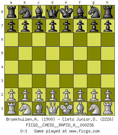 Last move : 0-1 2019 May 16 20:48:17 [Event "FICGS__CHESS__RAPID_A__000236"] [Site "FICGS"] [Date "2019.04.16"] [Round "1"] [White "Broekhuizen,A. T. S."] [Black "Cleto Junior,Dirceu"] [Result "0-1"] [WhiteElo "1900"] [BlackElo "2226"] 0-1 This chess game has been lost on time (started : 2019.04.16 14:2:9) Player Black won this chess game. Follow this game move after move (download)The passed Pawn is a criminal, who should be kept under lock and key. Mild measures, such as police surveillance, are not sufficient. (Aaron Nimzovich) Die Idee von Capablanca, Schach als Fach in den Schulen zu lehren, ist großartig. (Fidel Castro) No soy una persona materialista y por eso, no resiento la falta o pérdida del dinero. La ausencia de cosas mundanas carece de importancia. Ya que el Ajedrez es una forma en la que puedo ser tan materialista como yo desee sin tener la necesidad de vender mi alma. (Jamie Walter Adams) Le joueur d'Echecs qui veut atteindre le top est obligé de développer son propre credo créatif. Alexeï Stepanovicth Souétine. Il est facile d'écrire des livres ! Ce qui est difficile, c'est de jouer ! (Alexeï Stepanovicth Souétine) Knowledge will give you power, but character respect. (Bruce Lee)