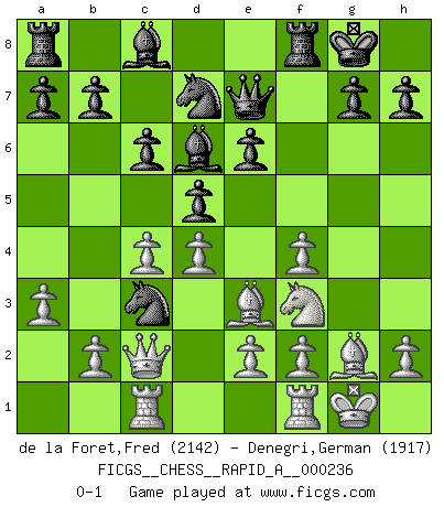 Last move : 0-1 2019 June 15 20:2:53 [Event "FICGS__CHESS__RAPID_A__000236"] [Site "FICGS"] [Date "2019.04.16"] [Round "1"] [White "de la Foret,Fred"] [Black "Denegri,German"] [Result "0-1"] [WhiteElo "2142"] [BlackElo "1917"] 1.d4 e6 2.c4 f5 3.g3 Nf6 4.Bg2 d5 5.Nf3 c6 6.O-O Bd6 7.Qc2 O-O 8.Nc3 Ne4 9.Be3 Nd7 10.Rac1 Qe7 11.a3 f4 12.gxf4 Nxc3 0-1 This chess game has been lost on time (started : 2019.04.16 14:2:9) Queen's pawn Kingside Castling by player White (move 6) Kingside Castling by player Black (move 7) Player Black won this chess game. Follow this game move after move (download)There just isn't enough televised Chess. (David Letterman) Der 70jährige Viktor Kortschnoi: Die Rentenanstalt wollte mich zwingen in Rente zu gehen. Meine Frau erhält jetzt eine Pension- und ich zahle weiter in die Rentenkasse ein! (Viktor Kortschnoi) Tu sabes que vas a perder. Aún cuando tenía la ventaja, yo sabía que iba a perder. - al estar jugando con Fischer (Andrew Soltis) Le plus grand jeu de l'esprit jamais inventé, plus vous l'apprenez, plus vous y prenez du plaisir. (Garry Kasparov) Thibault, I ask for draw. Game 13876. - Sorry Ilmars, you won. (FICGS chat)