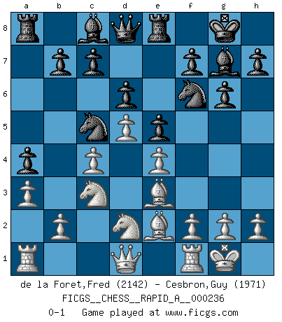 Last move : 0-1 2019 June 13 0:24:54 [Event "FICGS__CHESS__RAPID_A__000236"] [Site "FICGS"] [Date "2019.04.16"] [Round "1"] [White "de la Foret,Fred"] [Black "Cesbron,Guy"] [Result "0-1"] [WhiteElo "2142"] [BlackElo "1971"] 1.d4 Nf6 2.c4 g6 3.Nc3 Bg7 4.e4 d6 5.Nf3 O-O 6.Be2 e5 7.Be3 Nbd7 8.O-O Re8 9.d5 Nc5 10.Nd2 a5 11.a3 a4 0-1 This chess game has been lost on time (started : 2019.04.16 14:2:9) King's Indian : Gligoric-Taimanov system Kingside Castling by player Black (move 5) Kingside Castling by player White (move 8) Player Black won this chess game. Follow this game move after move (download)A good sacrifice is one that is not necessarily sound but leaves your opponent dazed and confused. (Rudolph Spielmann) Frage des Reporters: -Worin besteht das Ziel von Gambiteröffnungen? Antwort: -Auf Kosten der Partie einen Ruf als Angriffspieler zu erwerben.- (Siegbert Tarrasch) El Ajedrez es el arte del análisis. (Mikhail Botvinnik) Les échecs sont utiles à l'exercice de la faculté de penser et à celle de l'imagination. Car nous devons posséder une méthode élaborée pour atteindre des buts partout où nous devons conduire notre raison. (Leibnitz) The various flowers seem good to different people. (Chinese proverb)