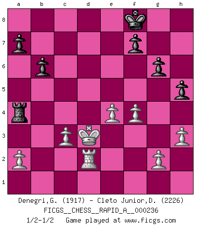 Last move : 1/2-1/2 2019 June 15 17:29:43 [Event "FICGS__CHESS__RAPID_A__000236"] [Site "FICGS"] [Date "2019.04.16"] [Round "1"] [White "Denegri,German"] [Black "Cleto Junior,Dirceu"] [Result "1/2-1/2"] [WhiteElo "1917"] [BlackElo "2226"] 1.c4 Nf6 2.Nc3 g6 3.e4 d6 4.d4 Bg7 5.f3 O-O 6.Be3 c5 7.dxc5 dxc5 8.Qxd8 Rxd8 9.Bxc5 Nc6 10.Nge2 h6 11.Rd1 Rxd1+ 12.Kxd1 b6 13.Be3 Nd7 14.Kc2 Nde5 15.Nd4 Nxc4 16.Nxc6 Nxe3+ 17.Kd3 Nxf1 18.Nxe7+ Kf8 19.Nxc8 Bxc3 20.bxc3 Ne3 21.Kxe3 Rxc8 22.Kd3 Rc5 23.Rd1 Rh5 24.h3 Ra5 25.Rd2 Ra4 26.f4 h5 1/2-1/2 English Opening Kingside Castling by player Black (move 5) This chess game ended in a draw. Follow this game move after move (download)Many Chess players were surprised when after the game, Fischer quietly explained: 'I had already analyzed this possibility' in a position which I thought was not possible to foresee from the opening. (Mikhail Tal) Der Knackpunkt bei der Konzentration ist, daß wir nur durch sie etwas Neues und Ungewöhnliches am Schachbrett finden können. Sie ist der einzige Weg durch neue neue Ideen eine Überraschung zu bereiten. (Garry Kasparov) EL Ajedrez es como la vida. (Boris Spassky) Seul un grand joueur sait à quel point il joue faiblement. (Xavier Tartacover) He who is a good ruler must first have been ruled. (Aristotle)