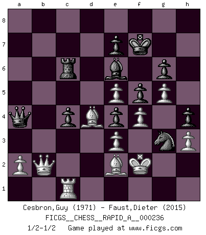 Last move : 1/2-1/2 2019 August 3 1:26:33 [Event "FICGS__CHESS__RAPID_A__000236"] [Site "FICGS"] [Date "2019.04.16"] [Round "1"] [White "Cesbron,Guy"] [Black "Faust,Dieter"] [Result "1/2-1/2"] [WhiteElo "1971"] [BlackElo "2015"] 1.f4 d5 2.Nf3 g6 3.g3 Bg7 4.Bg2 c6 5.O-O Nh6 6.Nc3 O-O 7.d4 Nf5 8.e3 Nd6 9.b3 Nd7 10.Bb2 Nf6 11.Ne5 h5 12.h3 Nf5 13.Qf3 h4 14.g4 Ng3 15.Rfd1 Qe8 16.Qf2 Nfe4 17.Nxe4 dxe4 18.Nc4 f5 19.g5 b6 20.Rd2 Be6 21.Ne5 Bxe5 22.dxe5 c5 23.c4 a6 24.Bf1 b5 25.cxb5 axb5 26.Rc2 Qc6 27.Bd4 c4 28.Rac1 Rfc8 29.Qd2 Qa6 30.bxc4 bxc4 31.Rb2 Kf7 32.Qc3 Qa4 33.Be2 Rab8 34.Kf2 Rxb2 35.Qxb2 Rc6 1/2-1/2 Bird's Opening Kingside Castling by player White (move 5) Kingside Castling by player Black (move 6) This chess game ended in a draw. Follow this game move after move (download)One bad move nullifies forty good ones. (Horowitz) Es genügt nicht ein guter Spieler zu sein, man muß auch gut spielen. (Siegbert Tarrasch) El Ajedrez tiene tanto misterio como las mujeres. (Purdy) J'ai toujours senti une vague pitié pour l'homme qui ne connaît rien aux échecs, tout comme j'en aurais pour un homme ignorant de l'amour. Les Echecs, comme la musique ou comme l'amour, ont le pouvoir de rendre heureux. (Siegbert Tarrasch) The difference between stupidity and genius is that genius has its limits. (Murphy)