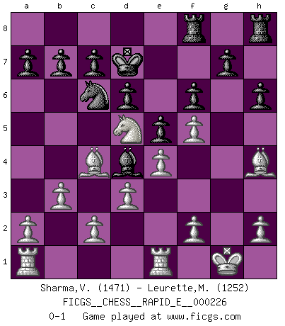 Last move : 0-1 2019 June 3 22:55:52 [Event "FICGS__CHESS__RAPID_E__000226"] [Site "FICGS"] [Date "2019.04.17"] [Round "1"] [White "Sharma,Vivek"] [Black "Leurette,Marc-Antoine"] [Result "0-1"] [WhiteElo "1471"] [BlackElo "1252"] 1.e4 e5 2.Nf3 Nc6 3.Bc4 Nf6 4.d3 Bc5 5.O-O d6 6.Bg5 Bg4 7.b3 Bxf3 8.gxf3 h6 9.Bh4 Qe7 10.Re1 Nh5 11.f4 f6 12.Qxh5+ Kd7 13.Nc3 Bd4 14.Nd5 Qe8 15.Qxe8+ Raxe8 16.f5 Ref8 0-1 This chess game has been lost on time (started : 2019.04.17 23:19:59) Two knights defense (Modern Bishop's Opening) Kingside Castling by player White (move 5) Player Black won this chess game. Follow this game move after move (download)Do you realize Fischer almost never has any bad pieces? He exchanges them, and the bad pieces remain with his opponents. (Yuri Balashov) Ich habe die besten Aussichten, den ersten Preis zu gewinnen - denn jeder muss gegen Steinitz spielen, nur ich nicht! (Wilhelm Steinitz) Haz el enroque temprano y seguido. (Rob Sillars) Votre prénom est 'Tactique', votre deuxième prénom est 'Tactique' et votre nom est 'Tactique'. (Ken Smith) The Internet is the first thing that humanity has build that humanity doesn't understand, the largest experiment in anarchy that we have ever had. (Eric Schmidt)