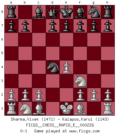 Last move : 0-1 2019 April 29 13:57:56 [Event "FICGS__CHESS__RAPID_E__000226"] [Site "FICGS"] [Date "2019.04.17"] [Round "1"] [White "Sharma,Vivek"] [Black "Kalapos,Karol"] [Result "0-1"] [WhiteElo "1471"] [BlackElo "1143"] 1.e4 c5 2.d4 cxd4 3.Qxd4 Nc6 4.Nf3 Nxd4 0-1 Sicilian : Smith-Morra gambit Player Black won this chess game. Follow this game move after move (download)We don't really know how the game was invented, though there are suspicions. As soon as we discover the culprits, we'll let you know. (Bruce Pandolfini) Rauchen ist dem Schachspieler bei seiner Arbeit, also im Wettkampf, untersagt. (Viktor Kortschnoi) No todos los artistas son jugadores de Ajedrez, pero todos los jugadores de Ajedrez son artistas. (Marcel Duchamp) La victoire dans une partie d'Echecs appartient la plupart du temps à celui qui voit un peu plus loin que l'adversaire. (Lasker) Luck never made a man wise. (Seneca, Letters to Lucilius)