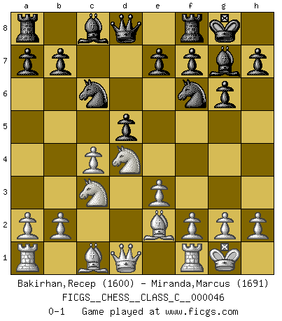 Last move : 0-1 2007 July 22 0:15:10 [Event "FICGS__CHESS__CLASS_C__000046"] [Site "FICGS"] [Date "2007.06.09"] [Round "1"] [White "Bakirhan,Recep"] [Black "Miranda,Marcus"] [Result "0-1"] [WhiteElo "1600"] [BlackElo "1691"] 1.d4 Nf6 2.Nf3 g6 3.c4 Bg7 4.Nc3 O-O 5.e3 c5 6.Be2 cxd4 7.Nxd4 d5 8.O-O Nc6 0-1 This chess game has been lost on time (started : 2007.06.09 16:49:55) King's Indian : East Indian defense Kingside Castling by player Black (move 4) Kingside Castling by player White (move 8) Player Black won this chess game. Follow this game move after move (download)Chess is like war on a board. (Bobby Fischer) Ich weiss nicht was Gott gegen mich auf 1.e4 antworten würde. (Robert James Fischer) Las leyes del Ajedrez no permiten una libre elección: tienes que mover quieras o no. (Emanuel Lasker) Mais l'homme est une créature légère et illogique : semblable au joueur d'échecs, il n'aime que le processus du but à atteindre, non le but lui-même. (Dostoïevsky) Before all elsed, be armed. (Niccolo Machiavelli)
