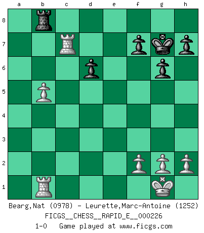 Last move : 1-0 2019 June 18 21:50:9 [Event "FICGS__CHESS__RAPID_E__000226"] [Site "FICGS"] [Date "2019.04.17"] [Round "1"] [White "Bearg,Nat"] [Black "Leurette,Marc-Antoine"] [Result "1-0"] [WhiteElo "0978"] [BlackElo "1252"] 1.e4 e5 2.Nf3 Nc6 3.d4 exd4 4.Nxd4 Nf6 5.Bc4 Bc5 6.c3 d6 7.O-O O-O 8.Qb3 Nxd4 9.cxd4 Bxd4 10.Be3 Bxe3 11.Qxe3 Re8 12.e5 Rxe5 13.Qd4 Be6 14.Bxe6 Rxe6 15.Nc3 c5 16.Qf4 Qd7 17.Rad1 Rae8 18.Qd2 Ne4 19.Nxe4 Rxe4 20.a3 b5 21.b4 cxb4 22.axb4 R4e6 23.Qd5 Rc8 24.Ra1 Rc6 25.Qxb5 g6 26.Qb8+ Kg7 27.Rxa7 Rc7 28.Rxc7 Qe8 29.Qxe8 Rxe8 30.Rb1 Rb8 31.b5 1-0 Scotch : Schmidt variation Kingside Castling by player White (move 7) Kingside Castling by player Black (move 7) Player White won this chess game. Follow this game move after move (download)Blessed be the memory of him who gave the world this immortal game. (A. G. Gardiner) Ich bin Weltmeister und muß mit niemandem irgend etwas diskutieren. (Viswanathan Anand) Te sientas frente a un tablero y repentinamente tu corazón brinca. Tu mano tiembla al tomar una pieza y moverla. Pero lo que el Ajedrez te enseña es que tu debes permanecer ahí con calma y pensar de que si realmente es una buena idea o de que si hay otras ideas mejores. (Stanley Kubrick) Les ravages du H expliquent la différence de niveau entre Tal et Thal [Abergel]. Good decisions come from experience, and experience comes from bad decisions. (Anonymous)