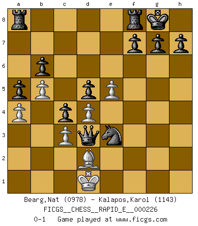 Last move : 0-1 2019 June 27 23:19:31 [Event "FICGS__CHESS__RAPID_E__000226"] [Site "FICGS"] [Date "2019.04.17"] [Round "1"] [White "Bearg,Nat"] [Black "Kalapos,Karol"] [Result "0-1"] [WhiteElo "0978"] [BlackElo "1143"] 1.e4 c5 2.Nf3 d6 3.Bc4 Nc6 4.Nc3 a6 5.Ng5 e6 6.Qf3 Qxg5 7.O-O Nd4 8.Qd3 Qd8 9.a3 Be7 10.b4 b6 11.b5 a5 12.a4 Nf6 13.Bb2 Nh5 14.Rae1 Nf4 15.Qf3 Nxf3+ 16.gxf3 Bf6 17.Re3 O-O 18.e5 Bg5 19.Ne4 Nh3+ 20.Kg2 Bxe3 21.fxe3 d5 22.Bxd5 exd5 23.Ng3 Ng5 24.f4 Bh3+ 25.Kf2 Bxf1 26.Kxf1 Nf3 27.Bc3 Nxh2+ 28.Kg2 Qh4 29.d4 c4 30.Be1 Ng4 31.f5 Nxe3+ 32.Kf2 Nxf5 33.c3 Qxg3+ 34.Ke2 Qe3+ 35.Kd1 Qd3+ 36.Bd2 Ne3+ 0-1 This chess game has been lost on time (started : 2019.04.17 23:19:59) Sicilian Kingside Castling by player White (move 7) Kingside Castling by player Black (move 17) Player Black won this chess game. Follow this game move after move (download)I am the best player in the world and I am here to prove it. (Bobby Fischer) Ich könnte leicht behaupten: Ja,ja, Leonid Breschnew wollte nicht, daß ich Weltmeister werde. In der Tat war die Sache komplizierter. (Viktor Kortschnoi) Aquel que teme a un Peón de Reina aislado, debería de retirarse del Ajedrez. (Siegbert Tarrasch) Les réformistes prétendent que les progrès de la théorie conduiront à la disparition des échecs, et qu'il faut, pour leur rendre vie, en remanier les règles. En réalité, qu'exprime cette affirmation? Le mépris de l'intuition, de l'imagination et de tous les autres éléments qui font des échecs un art. (Alexander Alekhine) There will be no order, only chaos. (Sol Robeson in Pi by Darren Aronofsky)
