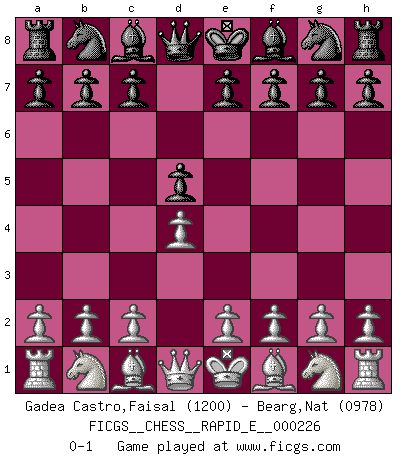 Last move : 0-1 2019 May 19 21:12:34 [Event "FICGS__CHESS__RAPID_E__000226"] [Site "FICGS"] [Date "2019.04.17"] [Round "1"] [White "Gadea Castro,Faisal"] [Black "Bearg,Nat"] [Result "0-1"] [WhiteElo "1200"] [BlackElo "0978"] 1.d4 d5 0-1 This chess game has been lost on time (started : 2019.04.17 23:19:59) Queen's pawn game Player Black won this chess game. Follow this game move after move (download)What is the object of playing a gambit opening?... To acquire a reputation of being a dashing player at the cost of losing a game. (Siegbert Tarrasch) Glücklicherweise sind Großmeister Ruben Fines reine Schachbücher weniger phallozentrisch [als seine Schachpsychologie] und deswegen auch weniger lächerlich. (Nigel Short) Una mala movida nulifica cuarenta buenas. (Horowitz) Le profane ne songe pas à la somme de jouissance dont il se prive, qui méconnaît ce jeu aux ressources aussi variées que passionnantes. (Jean-Marie Jeanton-Lamarche) Men never do evil so completely and cheerfully as when they do it from religious conviction. (Blaise Pascal)