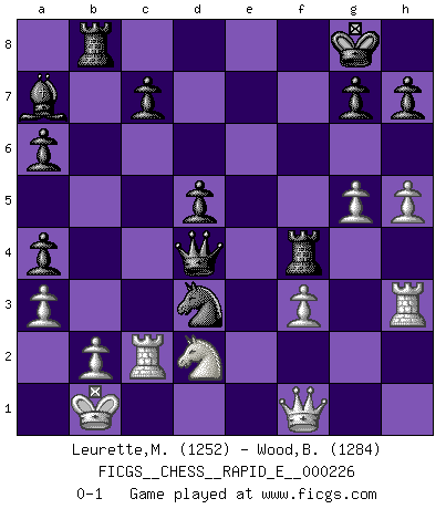 Last move : 0-1 2019 June 14 7:13:8 [Event "FICGS__CHESS__RAPID_E__000226"] [Site "FICGS"] [Date "2019.04.17"] [Round "1"] [White "Leurette,Marc-Antoine"] [Black "Wood,Brian"] [Result "0-1"] [WhiteElo "1252"] [BlackElo "1284"] 1.e4 e5 2.Nf3 Nc6 3.Bc4 Bc5 4.Nc3 Nf6 5.d3 d6 6.Bg5 O-O 7.Qe2 Be6 8.Bxe6 fxe6 9.a3 a6 10.O-O-O d5 11.Bxf6 Rxf6 12.exd5 exd5 13.d4 exd4 14.Na4 Ba7 15.h4 b5 16.g4 bxa4 17.g5 Rf4 18.h5 Re4 19.Qf1 Qf8 20.Nd2 Rf4 21.f3 Ne5 22.Rh3 d3 23.cxd3 Qc5+ 24.Kb1 Rb8 25.Rc1 Qd4 26.Rc2 Nxd3 0-1 Giuoco Piano : Four knights variation Kingside Castling by player Black (move 6) Queenside Castling by player White (move 10) Player Black won this chess game. Follow this game move after move (download)Weak points or holes in the opponent's position must be occupied by pieces not Pawns. (Siegbert Tarrasch) Ich habe Putins Aufstieg an die Macht beobachtet und seine Politik, die demokratischen Institutionen meines Landes zu zerstören. (Garry Kasparov) Juega la Apertura como un libro, el Juego Medio como un mago y los Finales como una máquina. (Spielmann) Ne tendez aucun piège pour le plaisir ! Ne jouez rien dans l'espoir que l'adversaire réagisse de façon stupide ! Prenez toujours pour acquis que l'adversaire va trouver le meilleur coup ! Ne jouez jamais de coup dans l'espoir que l'adversaire ne voie pas la menace ! Chacun de vos coups doit améliorer la position d'une façon ou d'une autre. Even the best needles are not sharp at both ends. (Chinese proverb)