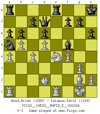 Last move : 0-1 2019 June 15 20:2:53 [Event "FICGS__CHESS__RAPID_E__000226"] [Site "FICGS"] [Date "2019.04.17"] [Round "1"] [White "Wood,Brian"] [Black "Kalapos,Karol"] [Result "0-1"] [WhiteElo "1284"] [BlackElo "1143"] 1.d4 e6 2.c4 Nf6 3.g3 Be7 4.Bg2 d6 5.Nc3 Nc6 6.Nf3 Bd7 7.O-O h6 8.e4 b6 9.Be3 O-O 10.d5 exd5 11.exd5 Na5 12.b3 Nh7 13.Nd2 Bf6 14.Rc1 Ng5 15.Nce4 Nxe4 16.Nxe4 Be5 17.f4 Bb2 18.Rb1 Ba3 19.Bc1 Bxc1 20.Qxc1 Bf5 21.b4 Nb7 22.a4 Re8 23.Re1 Kh8 24.Qd2 Qd7 25.b5 a6 26.Ra1 Na5 0-1 This chess game has been lost on time (started : 2019.04.17 23:19:59) Queen's pawn Kingside Castling by player White (move 7) Kingside Castling by player Black (move 9) Player Black won this chess game. Follow this game move after move (download)I believe that Chess possesses a magic that is also a help in advanced age. A rheumatic knee is forgotten during a game of Chess and other events can seem quite unimportant in comparison with a catastrophe on the chessboard. (Vlastimil Hort) Frage: Was machen Sie mit den Preisen? Anwort: Ich habe Angst, dass meine Freundin davon neue Kleider kauft. (Loek van Wely) El Ajedrez es despiadado: debes de estar preparado para matar gente. (Nigel Short) Vouloir jouer aux échecs contre soi-même est aussi paradoxal que vouloir marcher sur son ombre. (Stefan Zweig) Now you put water in a cup, it becomes the cup; You put water into a bottle it becomes the bottle; You put it in a teapot it becomes the teapot. Water can flow or it can crash. Be water, my friend. (Bruce Lee)