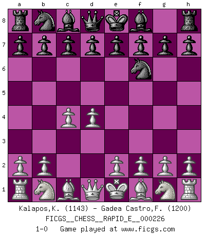Last move : 1-0 2019 May 19 9:12:37 [Event "FICGS__CHESS__RAPID_E__000226"] [Site "FICGS"] [Date "2019.04.17"] [Round "1"] [White "Kalapos,Karol"] [Black "Gadea Castro,Faisal"] [Result "1-0"] [WhiteElo "1143"] [BlackElo "1200"] 1.d4 Nf6 2.c4 1-0 This chess game has been lost on time (started : 2019.04.17 23:19:59) Queen's pawn game Player White won this chess game. Follow this game move after move (download)Half the variations which are calculated in a tournament game turn out to be completely superfluous. Unfortunately, no one knows in advance which half. (Jan Tinman) Eine Person mit durchschnittlichem IQ kann etwa eine ELO von 2000 erreichen. (Jonathan Levitt) Un sacrificio se refuta mucho mejor al aceptarlo. (Wilhelm Steinitz) Toute estimation doit être constamment réévaluée. (Jacob Estrin) All the troubles of the world come from being unable to sit alone in a quiet room. (Blaise Pascal)