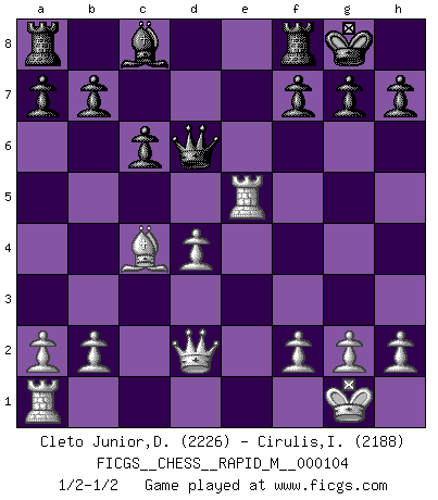 Last move : 1/2-1/2 2019 April 27 17:2:45 [Event "FICGS__CHESS__RAPID_M__000104"] [Site "FICGS"] [Date "2019.04.21"] [Round "1"] [White "Cleto Junior,Dirceu"] [Black "Cirulis,Ilmars"] [Result "1/2-1/2"] [WhiteElo "2226"] [BlackElo "2188"] 1.e4 e5 2.Nf3 Nc6 3.Bb5 Nf6 4.O-O Nxe4 5.Re1 Nd6 6.Nxe5 Nxe5 7.Rxe5+ Be7 8.Bf1 O-O 9.Nc3 Ne8 10.Nd5 Bd6 11.Re1 c6 12.Ne3 Be7 13.c4 Nc7 14.d4 d5 15.cxd5 Bb4 16.Bd2 Bxd2 17.Qxd2 Nxd5 18.Nxd5 Qxd5 19.Re5 Qd6 20.Bc4 1/2-1/2 Ruy Lopez : Berlin defense, Open variation Kingside Castling by player White (move 4) Kingside Castling by player Black (move 8) This chess game ended in a draw. Follow this game move after move (download)Up to this point White has been following well-known analysis. But now he makes a fatal error: he begins to use his own head. (Siegbert Tarrasch) Wir irren allesamt, nur jeder irrt anders. (Georg Christoph Lichtenberg) Los errores estan ahí, esperando a que se cometan. (Savielly Tartakower) Votre prénom est 'Tactique', votre deuxième prénom est 'Tactique' et votre nom est 'Tactique'. (Ken Smith) I'm extremely disappointed. I send you out for exciting, new designer drugs, you come back with tomato sauce. (Gregory House, House M.D.)