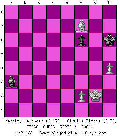 Last move : 1/2-1/2 2019 May 7 20:37:24 [Event "FICGS__CHESS__RAPID_M__000104"] [Site "FICGS"] [Date "2019.04.21"] [Round "1"] [White "Marciz,Alexander"] [Black "Cirulis,Ilmars"] [Result "1/2-1/2"] [WhiteElo "2117"] [BlackElo "2188"] 1.e4 e5 2.Nf3 Nc6 3.Bb5 Nf6 4.d3 Bc5 5.c3 O-O 6.O-O d5 7.exd5 Qxd5 8.Bc4 Qd8 9.b4 Be7 10.Qc2 Bf5 11.Nbd2 Nd5 12.Ne4 a6 13.a4 Bg4 14.Ne1 Qd7 15.Ng3 Rad8 16.Rb1 Nf4 17.d4 Nd5 18.b5 axb5 19.axb5 Na5 20.Bd3 exd4 21.cxd4 Nb4 22.Bxh7+ Kh8 23.Rxb4 Bxb4 24.h3 Be6 25.Nf3 Rfe8 26.Be4 Kg8 27.Bg5 f6 28.Bf4 Nc4 29.Bh7+ Kf8 30.Bg6 Re7 31.Bd3 Nb6 32.Nh4 Qxd4 33.Ng6+ Kf7 34.Be4 Qc4 35.Qxc4 Nxc4 36.Nxe7 Bxe7 37.Bxc7 Rd7 38.Bf4 Na3 39.h4 Nxb5 40.Rb1 Bd6 41.Rxb5 Bxf4 42.Nf1 Bc4 43.Rxb7 Rxb7 44.Bxb7 Bxf1 45.Bd5+ Kg6 46.Kxf1 Bd6 47.Bc4 Kh5 48.g3 g5 49.Bf7+ Kh6 50.Kg2 gxh4 51.gxh4 Ba3 1/2-1/2 Ruy Lopez : Berlin defense Kingside Castling by player Black (move 5) Kingside Castling by player White (move 6) 10 pieces endgame at move 44 : White KBPPP , Black KBBPP WHITE : King + 1 Bishop 3 Pawns BLACK : King + 2 Bishops 2 Pawns 9 pieces endgame at move 46 : White KBPPP , Black KBPP WHITE : King + 1 Bishop 3 Pawns BLACK : King + 1 Bishop 2 Pawns 8 pieces endgame at move 50 : White KBPP , Black KBPP WHITE : King + 1 Bishop 2 Pawns BLACK : King + 1 Bishop 2 Pawns 7 pieces endgame at move 51 : White KBPP , Black KBP WHITE : King + 1 Bishop 2 Pawns BLACK : King + 1 Bishop 1 Pawn This chess game ended in a draw. Follow this game move after move (download)Chess is the art which expresses the science of logic. (Mikhail Botvinnik) Im Leben werden Partien nie so unstrittig gewonnen wie im Spiel (Emanuel Lasker) El Ajedrez es un terrible juego. Si no controlas el centro, tu oponente tiene una posición mas holgada. Si tienes control del centro, ¡entonces realmente tu tienes algo de que preocuparte!. (Siegbert Tarrasch) L'action d'une oeuvre littéraire se déroule sur un champ de bataille. Les masques et les types du drame moderne correspondent aux pièces du jeu d'échecs. L'intrigue correspond aux coups et aux gambits, c'est à dire aux techniques du jeu telles qu'utilisées et interprétées par les joueurs. Les tactiques et les péripéties [mouvements] correspondent aux coups exécutés par l'adversaire. (Viktor Shklovsky) Some people are so afraid to die that they never begin to live. (Henry Van Dyke)