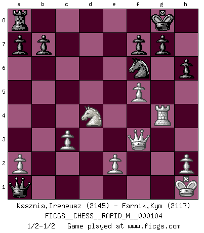 Last move : 1/2-1/2 2019 May 9 11:12:3 [Event "FICGS__CHESS__RAPID_M__000104"] [Site "FICGS"] [Date "2019.04.21"] [Round "1"] [White "Kasznia,Ireneusz"] [Black "Farnik,Kym"] [Result "1/2-1/2"] [WhiteElo "2145"] [BlackElo "2117"] 1.Nf3 Nf6 2.g3 d5 3.Bg2 c5 4.O-O e6 5.d4 cxd4 6.Nxd4 e5 7.Nb3 Be6 8.Bg5 Nbd7 9.Nc3 Be7 10.f4 exf4 11.gxf4 h6 12.Bxf6 Nxf6 13.f5 Bd7 14.Nxd5 O-O 15.Nxe7+ Qxe7 16.Qd3 Rfe8 17.Nd4 Qc5 18.c3 Bc6 19.Qg3 Qb6 20.Kh1 Bxg2+ 21.Qxg2 Re4 22.Rg1 Rg4 23.Qf3 Qxb2 24.Rxg4 Qxa1+ 1/2-1/2 Reti Opening Kingside Castling by player White (move 4) Kingside Castling by player Black (move 14) This chess game ended in a draw. Follow this game move after move (download)At this time Fischer is simply a level above all the best Chessplayers in the world. (John Jacobs) Kasparov ist eine Art Monster mit hundert Augen, denen auch nicht das Geringste entgeht. (Tony Miles) Todos los Maestros de Ajedrez fueron un día unos principiantes. (Chernev) Un footballeur joue avec ses pieds, parfois avec sa tête. Un joueur d'échecs ne joue qu'avec sa tête. Et quand il ne joue plus, il meurt. (Jacob Murray) The ultimate in disposing one's troops is to be without ascertainable shape. Then the most penetrating spies cannot pry in nor can the wise lay plans against you. (Sun Tzu)