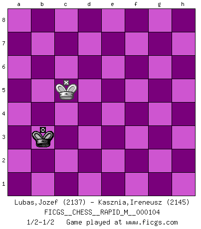 Last move : 1/2-1/2 2019 July 1 20:47:25 [Event "FICGS__CHESS__RAPID_M__000104"] [Site "FICGS"] [Date "2019.04.21"] [Round "1"] [White "Lubas,Jozef"] [Black "Kasznia,Ireneusz"] [Result "1/2-1/2"] [WhiteElo "2137"] [BlackElo "2145"] 1.d4 Nf6 2.c4 g6 3.Nc3 Bg7 4.e4 d6 5.Nf3 O-O 6.h3 e5 7.d5 Nh5 8.g3 Na6 9.Be3 f5 10.exf5 gxf5 11.Ng5 Nf6 12.Qd2 Qe7 13.O-O-O h6 14.Nf3 Nc5 15.Bxc5 dxc5 16.Re1 e4 17.Nh4 Qf7 18.Rg1 Ne8 19.g4 fxg4 20.Nxe4 Nd6 21.Bd3 Nxe4 22.Rxe4 Bd7 23.hxg4 Qxf2 24.Qxf2 Rxf2 25.Re7 Rd8 26.Rge1 Bxg4 27.Rxc7 Rd7 28.Rxd7 Bxd7 29.Re7 Bg4 30.d6 Rh2 31.Bf5 Rxh4 32.Bxg4 Rxg4 33.d7 Rxc4+ 34.Kb1 Rd4 35.Re8+ Kh7 36.d8Q Rxd8 37.Rxd8 h5 38.Rd7 Kg6 39.Rxb7 h4 40.Rxa7 h3 41.Ra3 h2 42.Rh3 Be5 43.Kc2 Kf5 44.Kd3 Kg4 45.Rxh2 c4+ 46.Kxc4 Bxh2 47.Kc5 Kf4 48.b4 Bg1+ 49.Kc6 Ke4 50.b5 Kd4 51.b6 Kc4 52.Kc7 Bxb6+ 53.Kxb6 Kb4 54.a3+ Kxa3 55.Kc5 Kb3 1/2-1/2 King's Indian : 5.Nf3 Kingside Castling by player Black (move 5) Queenside Castling by player White (move 13) Promotion Queen by player White (move 36) 10 pieces endgame at move 37 : White KRPP , Black KBPPPP WHITE : King + 1 Rook 2 Pawns BLACK : King + 1 Bishop 4 Pawns 9 pieces endgame at move 39 : White KRPP , Black KBPPP WHITE : King + 1 Rook 2 Pawns BLACK : King + 1 Bishop 3 Pawns 8 pieces endgame at move 40 : White KRPP , Black KBPP WHITE : King + 1 Rook 2 Pawns BLACK : King + 1 Bishop 2 Pawns 7 pieces endgame at move 45 : White KRPP , Black KBP WHITE : King + 1 Rook 2 Pawns BLACK : King + 1 Bishop 1 Pawn 6 pieces endgame at move 46 : White KRPP , Black KB WHITE : King + 1 Rook 2 Pawns BLACK : King + 1 Bishop 5 pieces endgame at move 46 : White KPP , Black KB WHITE : King + 2 Pawns BLACK : King + 1 Bishop 4 pieces endgame at move 52 : White KP , Black KB WHITE : King + 1 Pawn BLACK : King + 1 Bishop 3 pieces endgame at move 53 : White KP , Black K WHITE : King + 1 Pawn BLACK : King + 2 pieces endgame at move 54 : White K , Black K WHITE : King + BLACK : King + This chess game ended in a draw. Follow this game move after move (download)In Fischer's hands, a slight theoretical advantage is as good a being a Queen ahead. (Isaac Kashdan) Der Umstand, daß uns eine 7 Stunden Zeitkontrolle ermöglicht eine großartige, tiefe Partie zu spielen, ist für die Massenmedien nicht weiter von Bedeutung. (Alexej Shirov) Los errores estan ahí, esperando a que se cometan. (Savielly Tartakower) Dans le domaine de la peinture, de la gravure et de la sculpture, dès la première décennie de notre siècle, les artistes abandonnent la représentation de la partie d'échecs pour se concentrer sur les pièces, sur les échiquiers et sur toutes les variations auxquelles les unes et les autres peuvent donner lieu. On passe en quelque sorte d'un thème social à un thème musical (au sens de la musica médiévale, c'est-à-dire d'une notion qui inclue le rythme, l'harmonie, la construction et la déconstruction, etc.). Graphiquement et picturalement, l'échiquier apparaît comme une structure ouverte, dynamique, d'une richesse infinie, autorisant toutes les combinatoires et débouchant sur des mouvements et des rythmes de nature exponentielle. (Michel Pastoureau) Mac users swear by their computers. PC users swear at their computers. (Author unknown)
