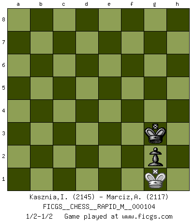 Last move : 1/2-1/2 2019 June 23 18:25:56 [Event "FICGS__CHESS__RAPID_M__000104"] [Site "FICGS"] [Date "2019.04.21"] [Round "1"] [White "Kasznia,Ireneusz"] [Black "Marciz,Alexander"] [Result "1/2-1/2"] [WhiteElo "2145"] [BlackElo "2117"] 1.Nf3 c5 2.g3 d5 3.Bg2 Nf6 4.O-O e6 5.d4 cxd4 6.Nxd4 e5 7.Nb3 Be6 8.Bg5 Nbd7 9.Nc3 Be7 10.f4 exf4 11.gxf4 h6 12.Bxf6 Nxf6 13.f5 Bd7 14.Nxd5 O-O 15.Nxe7+ Qxe7 16.Qd3 Bc6 17.c3 Bxg2 18.Kxg2 b5 19.Rae1 Rfe8 20.Rf4 Rad8 21.Qf3 Nd5 22.Rd4 Ne3+ 23.Kh1 Rd6 24.Rxd6 Qxd6 25.Rg1 a6 26.a3 Qf6 27.Nc5 Qxf5 28.Nxa6 Qc8 29.Nb4 Qe6 30.Qc6 Qe5 31.Nd3 Qb8 32.Qf3 Qb6 33.Nb4 Re6 34.Nd3 g6 35.Rg3 Nc4 36.Nf4 Re5 37.Nd3 Re7 38.Rg4 Re3 39.Qg2 Qe6 40.Nf4 Qf5 41.Nd3 Nd2 42.Rg3 Re4 43.h3 Re7 44.Kg1 Qe6 45.Nf4 Qa2 46.Qf2 Qxb2 47.Rd3 Re8 48.Nd5 Ne4 49.Qe3 Re6 50.Qxh6 Qxa3 51.Kg2 Re5 52.Qf4 Rg5+ 53.Kh2 Qc5 54.Re3 Qxd5 55.Rxe4 Kg7 56.h4 Rf5 57.Qe3 Qc5 58.Kg2 Qxe3 59.Rxe3 Rh5 60.Rh3 Rc5 61.Kf2 Rc4 62.h5 g5 63.Rf3 f6 64.Rf5 b4 65.cxb4 Rxb4 66.Kf3 Rh4 67.e4 Rxh5 68.e5 fxe5 69.Kg4 Kg6 70.Rxe5 Rh4+ 71.Kg3 Kf6 72.Rb5 Re4 73.Rb3 Kg6 74.Rb8 Kg7 75.Rb5 Kf6 76.Rb3 Kf5 77.Rb5+ Re5 78.Rxe5+ Kxe5 79.Kg4 Kf6 80.Kg3 Kf5 81.Kf3 g4+ 82.Kg3 Kg5 83.Kg2 Kf4 84.Kf2 g3+ 85.Kg2 Kg4 86.Kg1 Kf3 87.Kf1 g2+ 88.Kg1 Kg3 1/2-1/2 Comment by player 2 : Alexander Marciz : rysować Reti Opening Kingside Castling by player White (move 4) Kingside Castling by player Black (move 14) 10 pieces endgame at move 59 : White KRPPP , Black KRPPP WHITE : King + 1 Rook 3 Pawns BLACK : King + 1 Rook 3 Pawns 9 pieces endgame at move 65 : White KRPPP , Black KRPP WHITE : King + 1 Rook 3 Pawns BLACK : King + 1 Rook 2 Pawns 8 pieces endgame at move 65 : White KRPP , Black KRPP WHITE : King + 1 Rook 2 Pawns BLACK : King + 1 Rook 2 Pawns 7 pieces endgame at move 67 : White KRP , Black KRPP WHITE : King + 1 Rook 1 Pawn BLACK : King + 1 Rook 2 Pawns 6 pieces endgame at move 68 : White KR , Black KRPP WHITE : King + 1 Rook BLACK : King + 1 Rook 2 Pawns 5 pieces endgame at move 70 : White KR , Black KRP WHITE : King + 1 Rook BLACK : King + 1 Rook 1 Pawn 4 pieces endgame at move 78 : White KR , Black KP WHITE : King + 1 Rook BLACK : King + 1 Pawn 3 pieces endgame at move 78 : White K , Black KP WHITE : King + BLACK : King + 1 Pawn This chess game ended in a draw. Follow this game move after move (download)Some part of a mistake is always correct. (Savielly Tartakover) Die westlichen Werte sind eine Sprache, welche die Putin-Administration nicht versteht. (Garry Kasparov) En el Ajedrez, tal como en la vida, las bendiciones de hoy pueden ser el veneno del mañana. (Assaic) Vouloir jouer aux échecs contre soi-même est aussi paradoxal que vouloir marcher sur son ombre. (Stefan Zweig) Who needs drugs and alcohol if he can play Big Chess at FICGS ? (Heinz-Georg Lehnhoff)