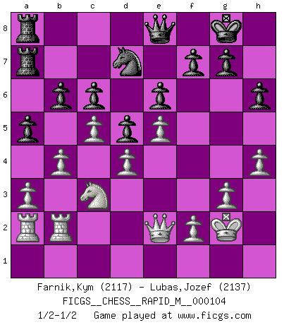 Last move : 1/2-1/2 2019 May 12 2:35:57 [Event "FICGS__CHESS__RAPID_M__000104"] [Site "FICGS"] [Date "2019.04.21"] [Round "1"] [White "Farnik,Kym"] [Black "Lubas,Jozef"] [Result "1/2-1/2"] [WhiteElo "2117"] [BlackElo "2137"] 1.Nf3 Nf6 2.d4 d5 3.c4 e6 4.Nc3 Be7 5.Bf4 O-O 6.e3 Nbd7 7.c5 Nh5 8.Bd3 Nxf4 9.exf4 b6 10.b4 a5 11.a3 c6 12.O-O Qc7 13.g3 Ba6 14.Bxa6 Rxa6 15.Qe2 R6a8 16.Rfb1 Bf6 17.Ne5 Bxe5 18.fxe5 Ra7 19.Ra2 Rfa8 20.R1b2 h6 21.Kg2 Qd8 22.h4 Qe8 1/2-1/2 Reti Opening Kingside Castling by player Black (move 5) Kingside Castling by player White (move 12) This chess game ended in a draw. Follow this game move after move (download)Examine moves that smite! A good eye for smites is far more important than a knowledge of strategical principles. (Purdy) Schach ist ein Teil der Kultur, und wenn es mit der Kultur abwärts geht, geht es auch mit dem Schach abwärts. (Mikhail Moiseyevich Botvinik) El Ajedrez moderno está demasiado preocupado con cosas como la estructura de Peones. Olvidenlo, el Jaque Mate termina la partida. (Nigel Short) Les échecs, c'est l'imagination. (David Bronstein) If computers get too powerful, we can organize them into committees. That'll do them in. (Anonymous)