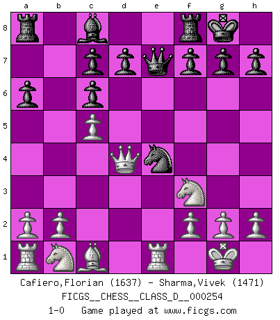 Last move : 1-0 2019 July 23 22:33:49 [Event "FICGS__CHESS__CLASS_D__000254"] [Site "FICGS"] [Date "2019.04.21"] [Round "1"] [White "Cafiero,Florian"] [Black "Sharma,Vivek"] [Result "1-0"] [WhiteElo "1637"] [BlackElo "1471"] 1.e4 e5 2.Nf3 Nc6 3.Bb5 Nf6 4.O-O Bc5 5.c3 O-O 6.d4 exd4 7.cxd4 a6 8.Bxc6 bxc6 9.dxc5 Nxe4 10.Qd4 Qe7 11.Re1 1-0 Ruy Lopez : Berlin defense, Beverwijk variation Kingside Castling by player White (move 4) Kingside Castling by player Black (move 5) Player White won this chess game. Follow this game move after move (download)Look at Garry Kasparov. After he loses, invariably he wins the next game. He just kills the next guy. That's something that we have to learn to be able to do. (Maurice Ashley) Wenn Du absolut nicht mehr weißt, was Du tun sollst, dann ist es Zeit für Panik. (John van der Wiel) El Ajedrez no es como la vida... ¡tiene reglas!. (Mark Pasternak) Si le désir cupide (et stupide) de gagner est une inépuisable source de souffrance, une combinaison brillante sur l'échiquier est une découverte : le coquelicot qui s'épanouit lorsque apparaît la Voie Lactée. (Arrabal) Lottery : A tax on people who are bad at math. (Author unknown)