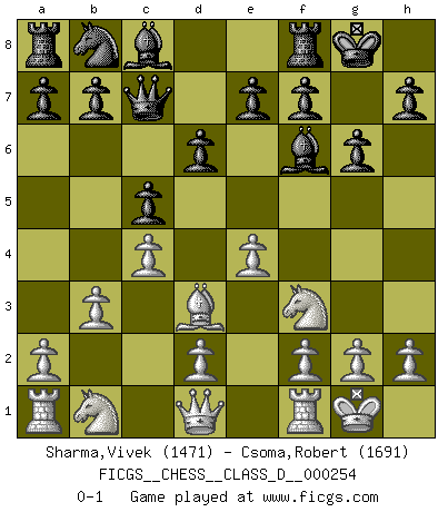 Last move : 0-1 2019 June 16 22:37:42 [Event "FICGS__CHESS__CLASS_D__000254"] [Site "FICGS"] [Date "2019.04.21"] [Round "1"] [White "Sharma,Vivek"] [Black "Csoma,Robert"] [Result "0-1"] [WhiteElo "1471"] [BlackElo "1691"] 1.e4 c5 2.Nf3 d6 3.Bd3 Nf6 4.O-O Qc7 5.c4 g6 6.b3 Bg7 7.Bb2 O-O 8.Bxf6 Bxf6 0-1 This chess game has been lost on time (started : 2019.04.21 19:54:17) Sicilian Kingside Castling by player White (move 4) Kingside Castling by player Black (move 7) Player Black won this chess game. Follow this game move after move (download)Chess is life. (Bobby Fischer) Stil? Ich habe keinen Stil! (Anatoly Karpov) Una mala movida nulifica cuarenta buenas. (Horowitz) Karpov est une pièce de musée. (Garry Kasparov) Heh, heh, heh. Time to abandon ship. (General Grievous in Star Wars ep.3)